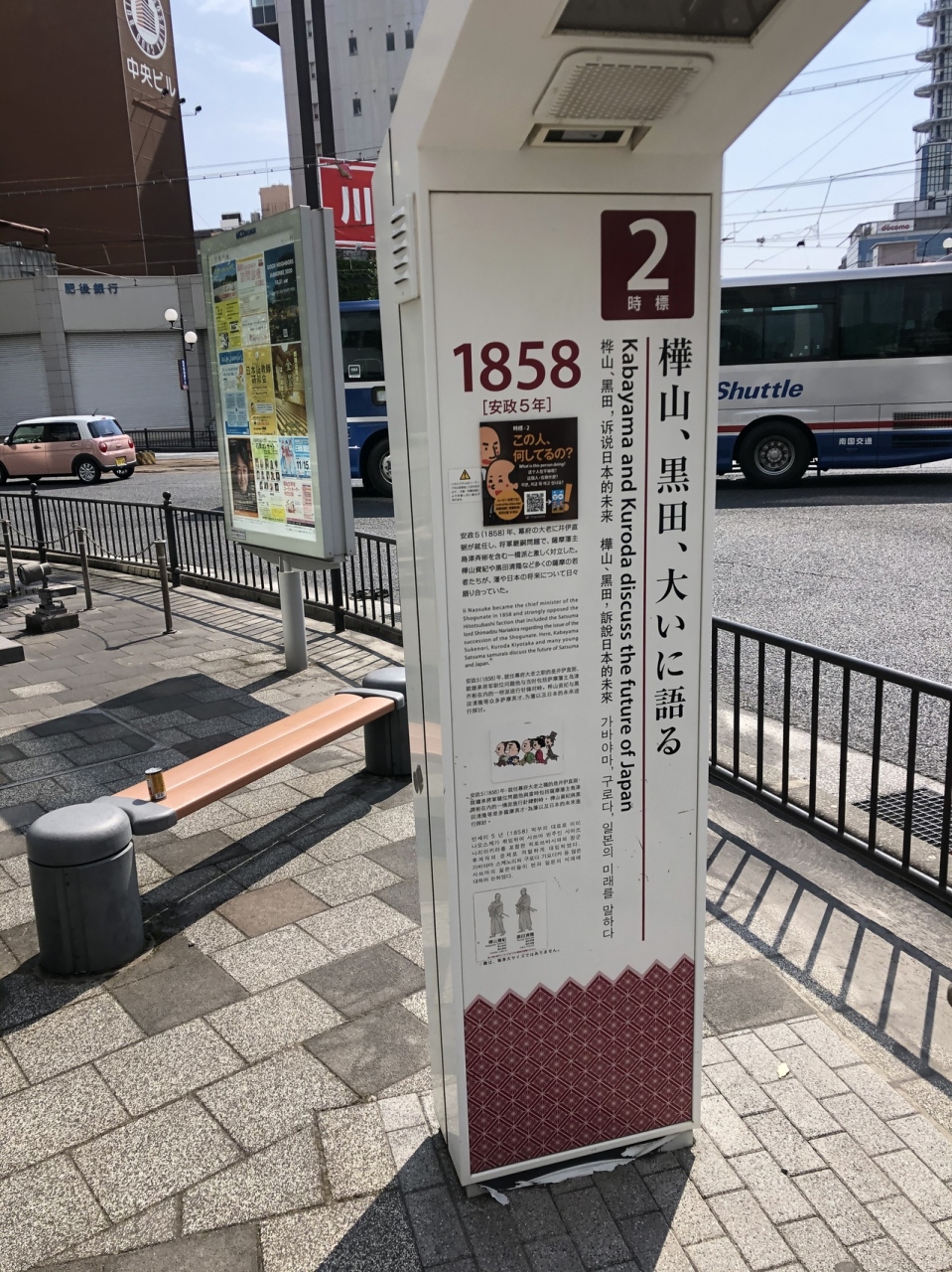 鹿児島市に行くと時々見かけるオブジェ。よく見るとQRコードがあります。そのQRコードで近代日本を作った人々に会うことができます。鹿児島市内に7ヶ所にあるようです。鹿児島に行くとついつい観光したくなる施設です。