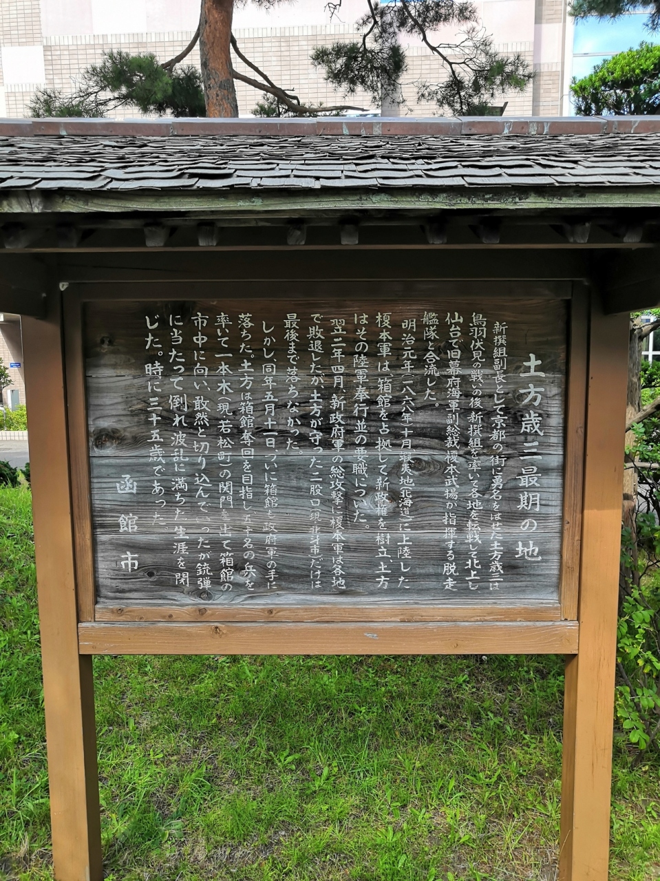 函館駅からですと、若干距離があるの10分くらいはかかると思います。小さな公園内に碑があります。土方が銃弾に倒れたといわれる場所が何箇所かあるようなんですが、そのうちの一つです。綺麗に花も供えられていて、敬愛されているのが感じられました。