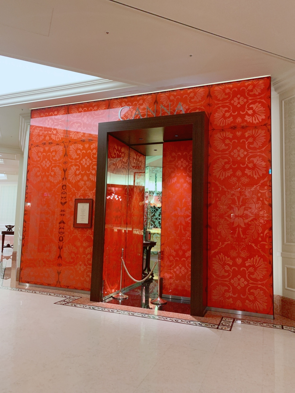 ディズニーランドホテルのアフタヌーンティを食べたく毎日予約サイトをチェックしていました。そこで常にこのカンナはあがっていて、予約。真っ赤な雰囲気で花がテーマなんですね。「ヘルシー&ビューティー」をテーマにした創作料理をタベラレました。