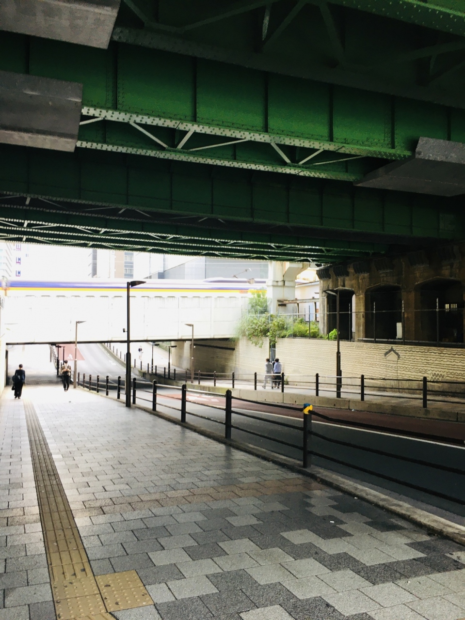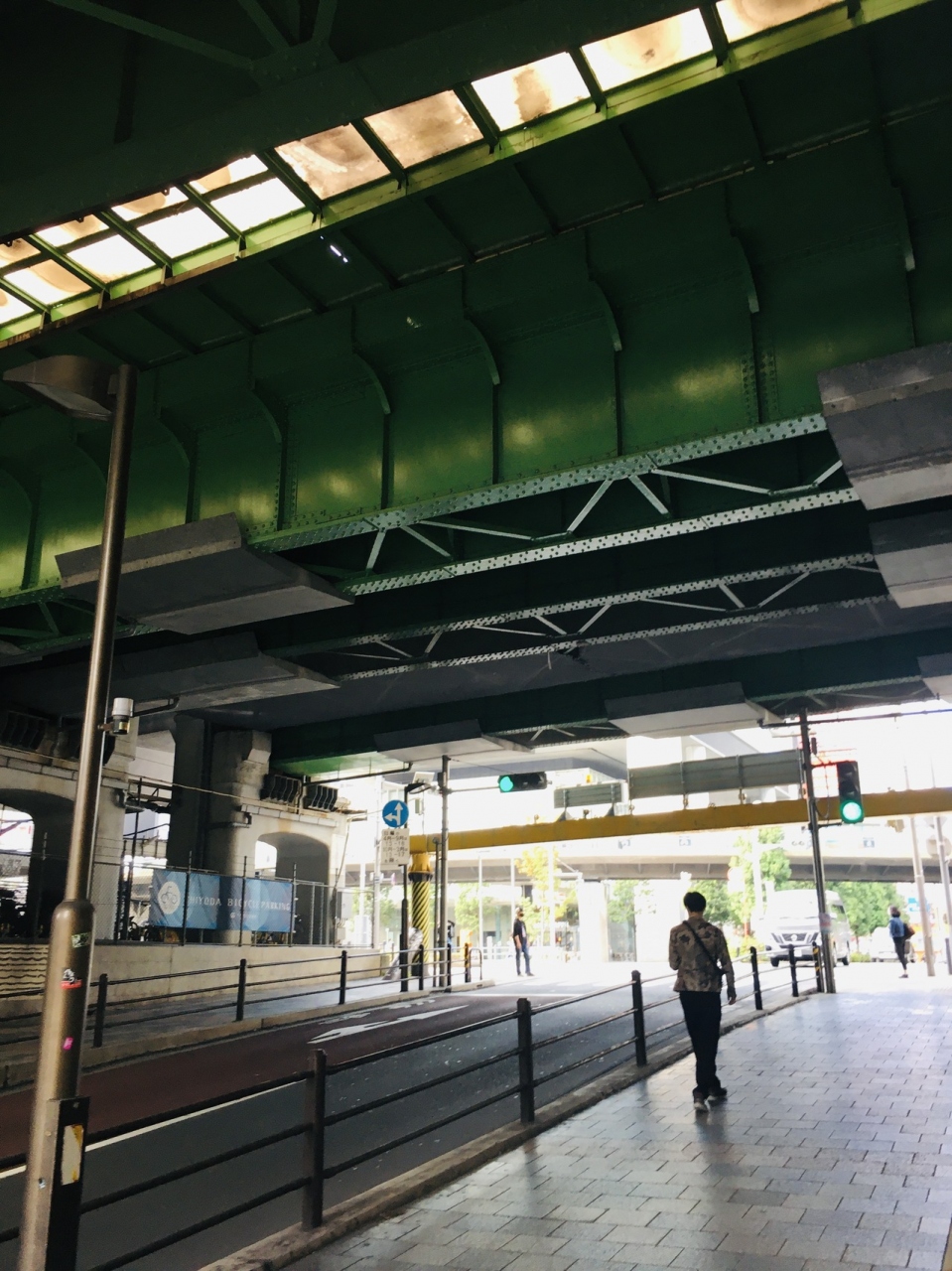 JR在来線が通る橋で下から見ると緑色の陸橋でした。電車の走る音が絶えず聞こえ、隣には新幹線が走っていました。下は車道で両サイドには歩道があり秋葉原駅から徒歩数分のため人通りが多かったです。よく見かける橋でした。