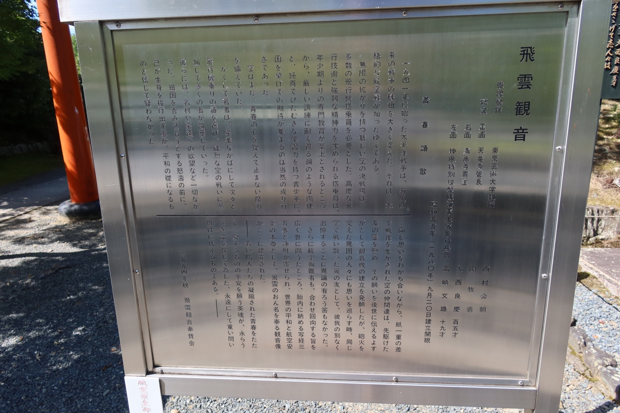 天龍寺の参道を進んだ先、右手にある八幡大菩薩の鳥居右手に飛雲観音があります。飛雲観音は航空安全、世界平和を祈願して建立されたものですが、ここに建立されたのは若くして戦争で散った航空兵を追悼するために作られました。