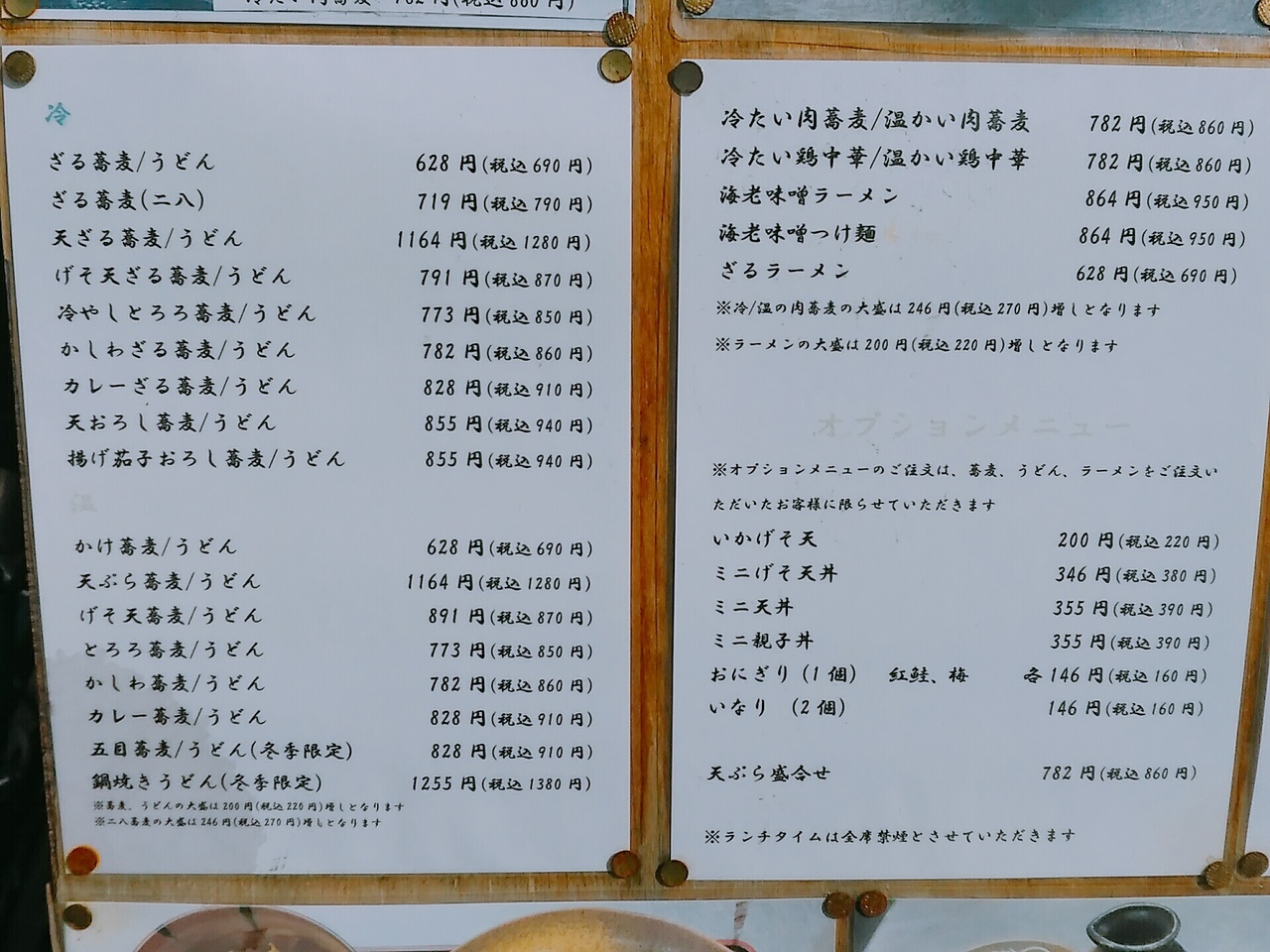 お昼の部はざる蕎麦やかけ蕎麦が690円からあります。季節限定のメニューでは牡蠣天ぷら蕎麦や仙台せり蕎麦等がありました。