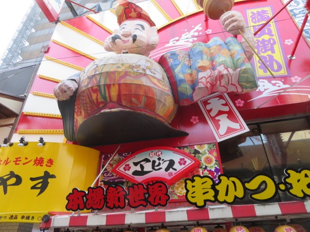 新世界の串カツやさん巡りは、大きなオブジェを見るのが楽しみです。こちらは、づぼらやのふぐの張りぼてに対抗するかのように、おおきな恵比須様の張りぼてが壁に張り付いてます。店内は広く、串カツだけでなく、お好み焼きもあり、大阪の味は全てそろいます。