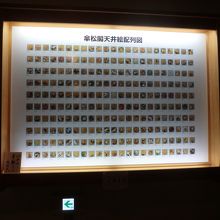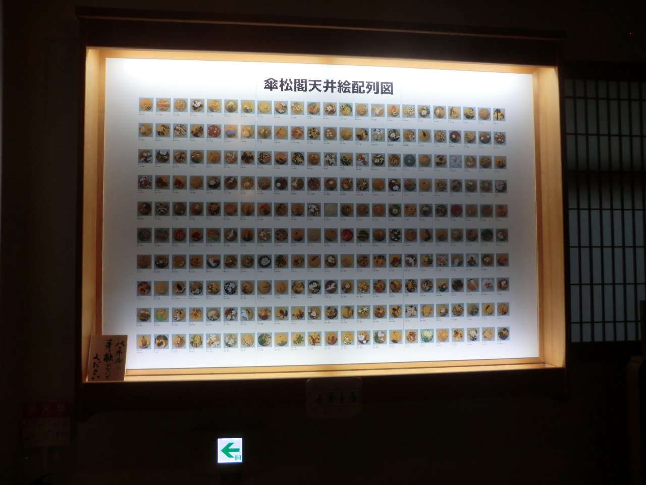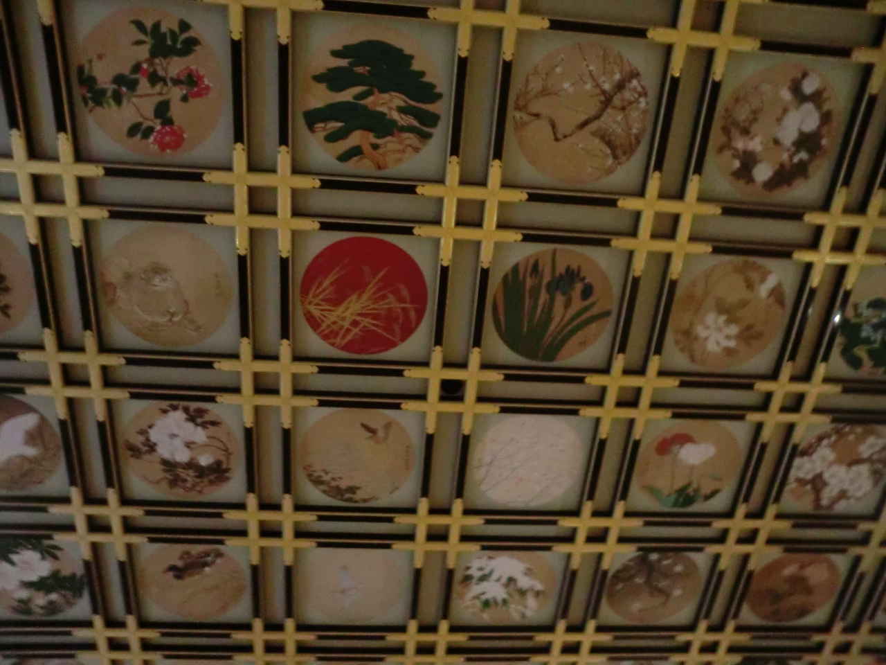 受付を済ませ「お参り」の順路を進むとここが最初になります。ここの見どころは大広間156畳=絵天井の間の天井に書かれた230枚の色彩ががあることです。見ごたえはありますがどれも同じに見えてきます。廊下側に230枚のミニチュアがあります。部屋の奥には大きな達磨さん??の絵があります。