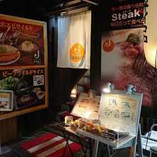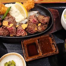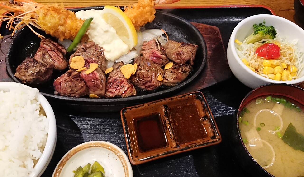 JR松山駅改札出て右手にあるサイコロステーキとジャンボエビフライのお店です、お店は2階で窓側は駅前が見渡せ開放的です、席数はそれほど多くは無いです、今回は一番人気と言うサイコロステーキとジャンボエビフライのセットにしてみました、サイコロステーキはスジもほぼ無く柔らかくてジューシーな美味しいお肉でした、エビフライは衣もサクサクで食べ応えのあるエビフライでボリュームも満足行くセットでした、松山駅で食事をするならおすすめのお店です。