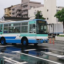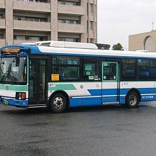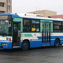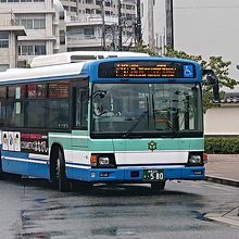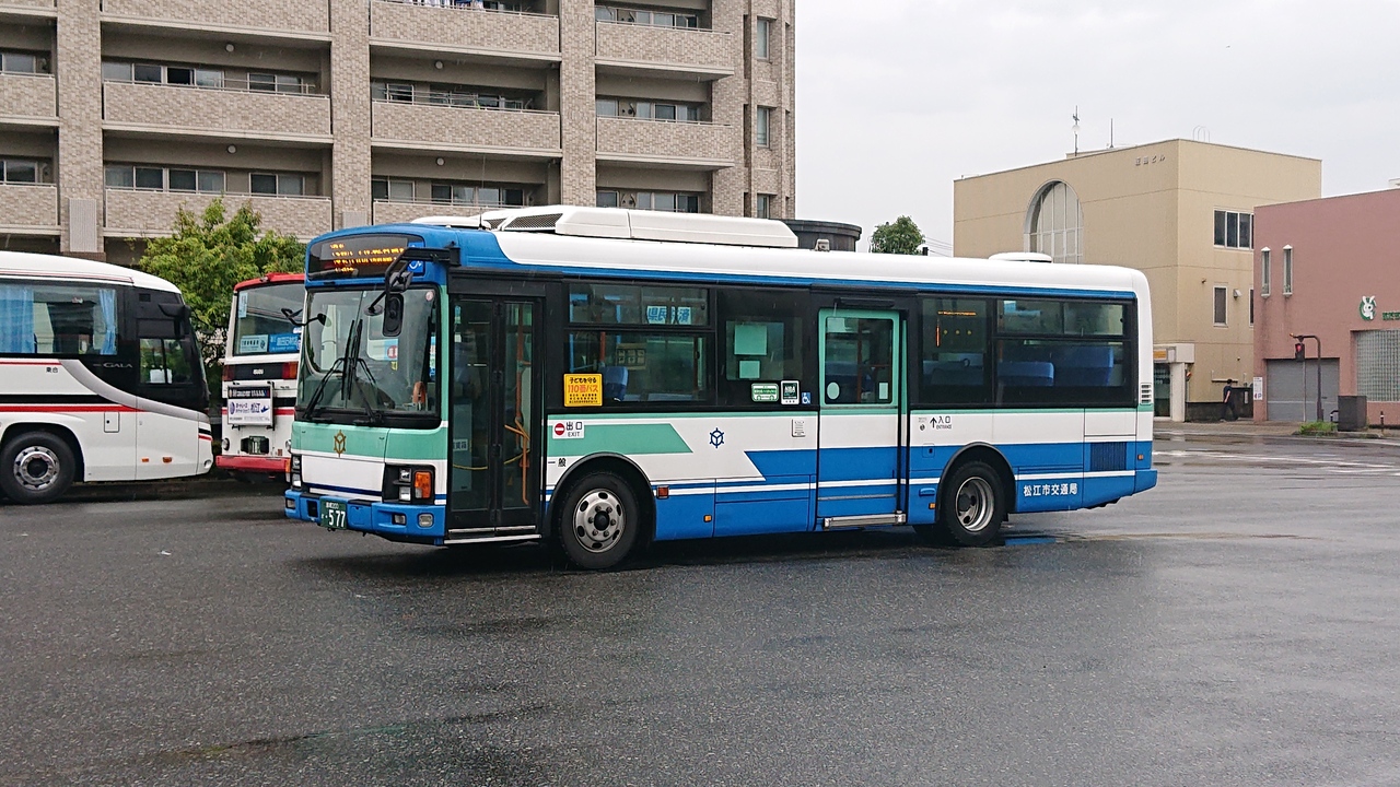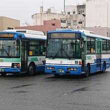 松江市内を走るバス。松江駅、松江しんじ湖温泉駅から市内の主要施設、観光施設を周遊する「ぐるっと松江レイクライン」も運行。松江市内は主に市営バスと一畑バスが運行していますが、2005年に合併した7つの町へは旧八束町エリアを除き、乗り入れません。松江市中心部は、城下町特有の狭い街路が多く残っていることから、中型車両が多い。また、ノンステップバスの導入は1997年からで、これは中国地方で一番早い。一畑バスと共通のバスカードは使用できますが、SuicaやICOCA、PASMOなど交通系ICカードは導入されていません。