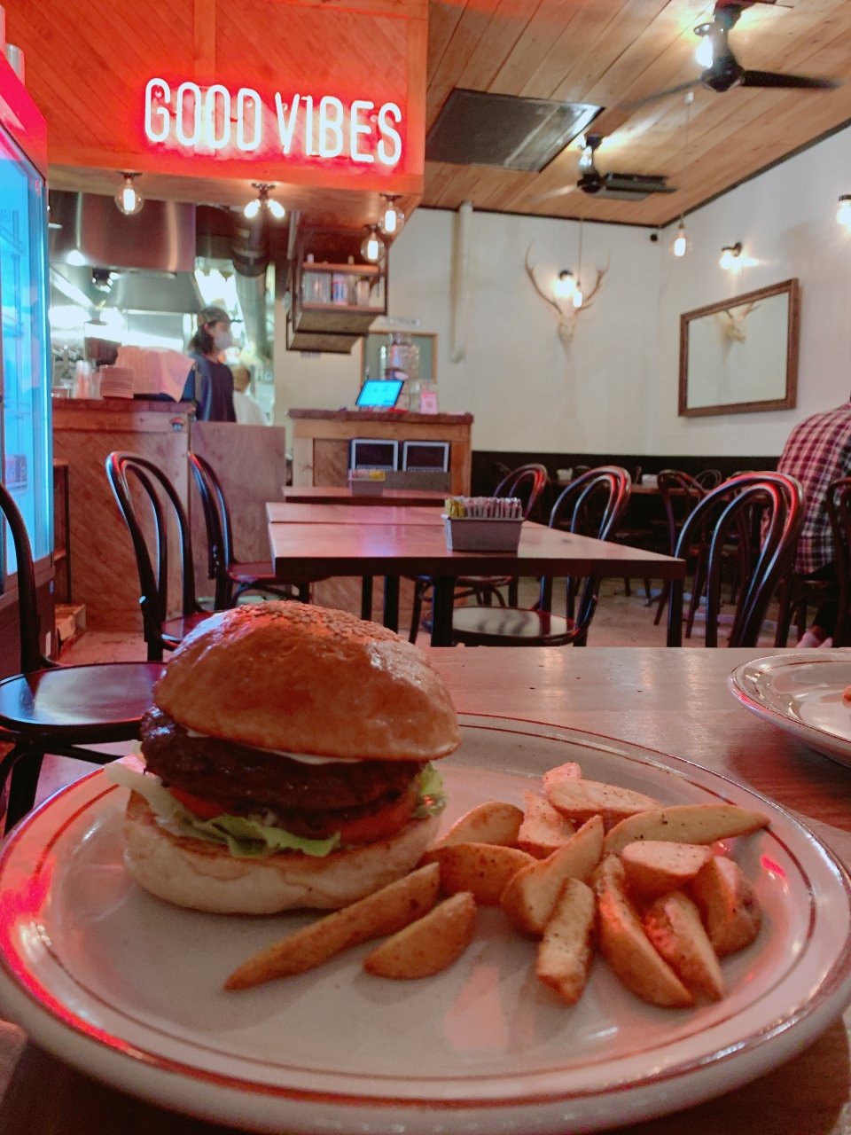 ずっと行ってみたかったハンバーガー屋さんです。映画前に友人といきました。ここはパテが絶対おいしいのでまずは基本に忠実にシンプルはージョンを。ソースがめちゃくちゃおいしいです。ポテト付きです。見た目もころんとしたフォルムがかわいい