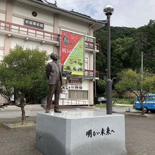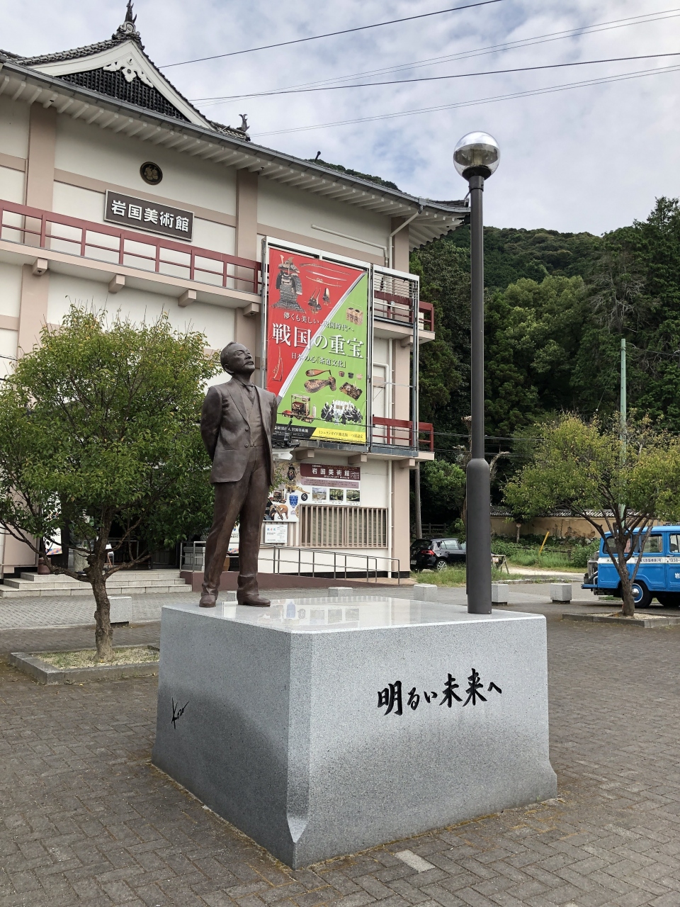 岩国城のロープウェイの乗り口の近くの岩国美術館の前にある、「日本のエジソン」と呼ばれている藤岡市助博士の像です。電灯を見上げるような感じになっていて、台座に書かれた「明るい未来へ」という文字がしっくりきました。