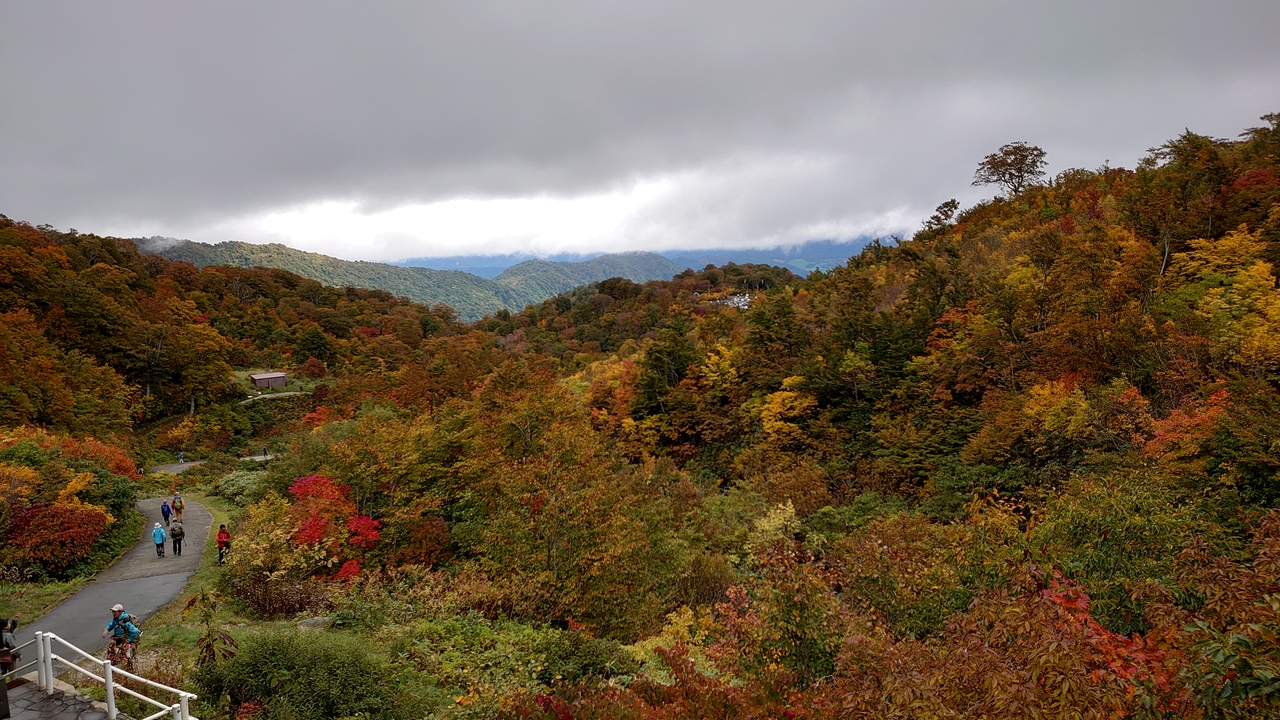 紅葉を見に行ってみました。ペアリフトに乗ろうと思うと駐車場から結構歩きます。最後の登り坂が結構きついです。ライブカメラで天気が良くないことは知っていましたが、下ってくる方の話を聞いてリフトの利用はしないことにしました。それでもそこそこに紅葉を楽しめました。月山から戻る途中に地元の方が利用しているのを見て、月山の水をいただきました。富山・新潟に続いて湧水を飲めてうれしかったです。