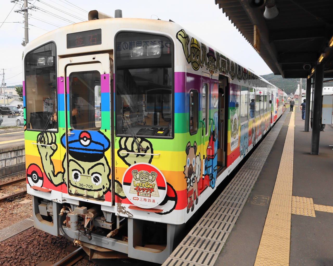 乗車した車両は、お馴染みの車両とポケモンのラッピング車両の2両編成。