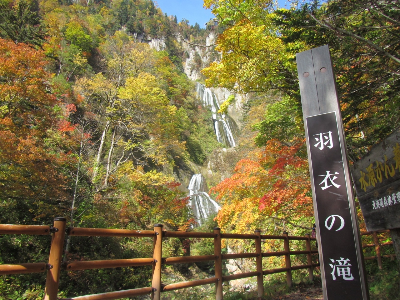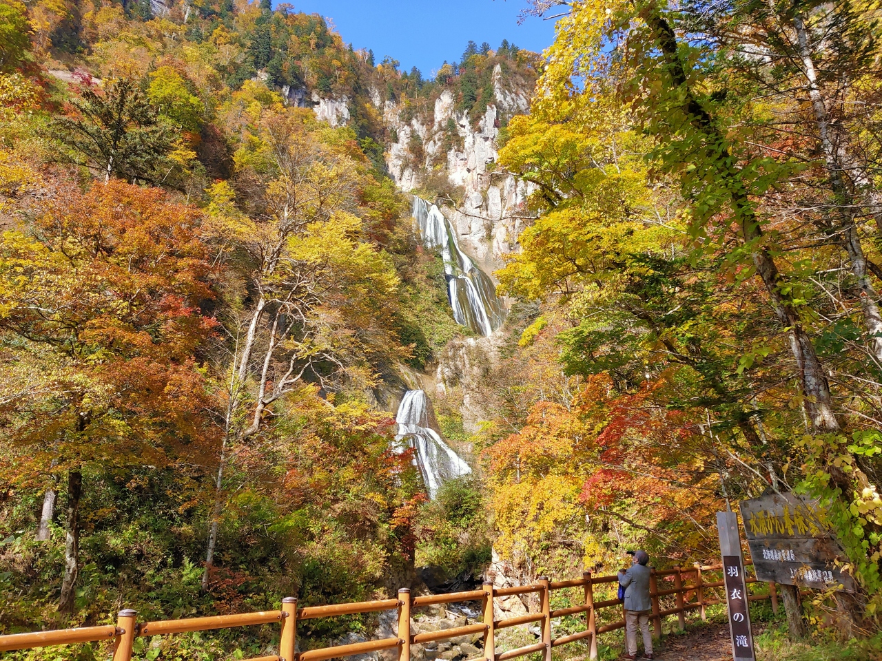 羽衣の滝は、落差270メートルとされ、滝見台から少し離れているため、やや小さく見上げる感じですが、それでも見事な滝姿とスケールが伝わってきます。