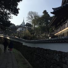 名前の通りにお寺越しに教会が見える小道ですが、和風な塀の奥に教会が見えます。