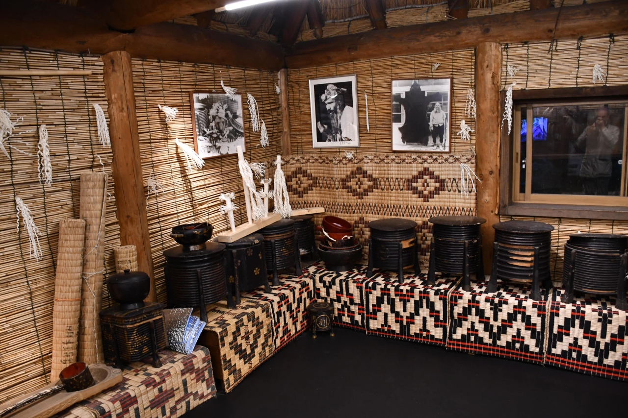 家族旅行で道東巡りをしました。二日目の宿が阿寒湖温泉でした。いかにも温泉街という、お土産物屋さんなどが軒を連ねる一画に、このアイヌ古潭があります。ここもお土産物を売る店が多いのですが、劇場や小さな博物館があるのが独特なところです。