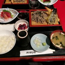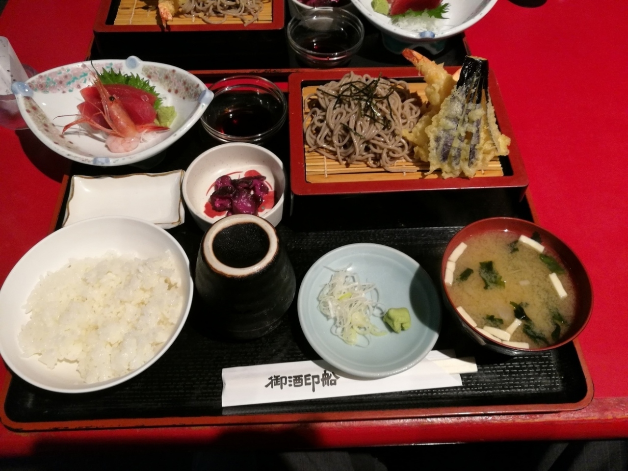オーダーは天ぷら、刺身、そばの人気セットとあった伊達御膳としました。確かにメニューの写真どおりでしたが、ちょっと元気がないかなという感じです。ランチだからかもしれませんが、前回はもっと活きが良く、店全体にも活気があった気がしたので、少し残念でした。