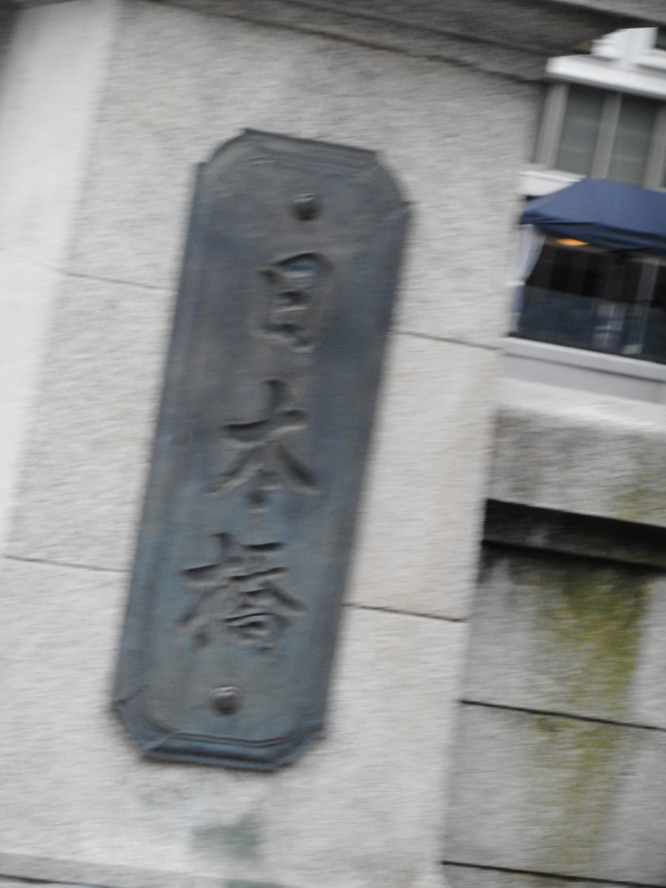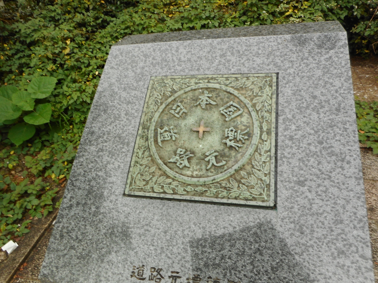 京橋に向かっての右手に日本橋の麒麟の橋の手前に在るのが”日本国道路元標”で、緑の芝生の中に在ります。これはレプリカで、ここを起点としての五街道を表しているそうです。日々、日常で通りますので、いつも、眺めて歩いています。