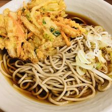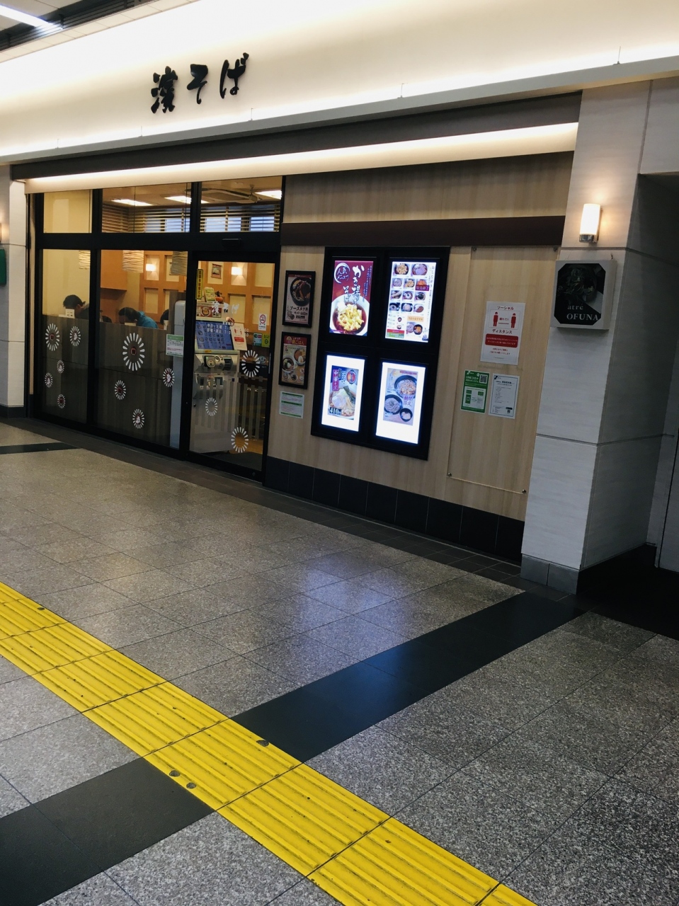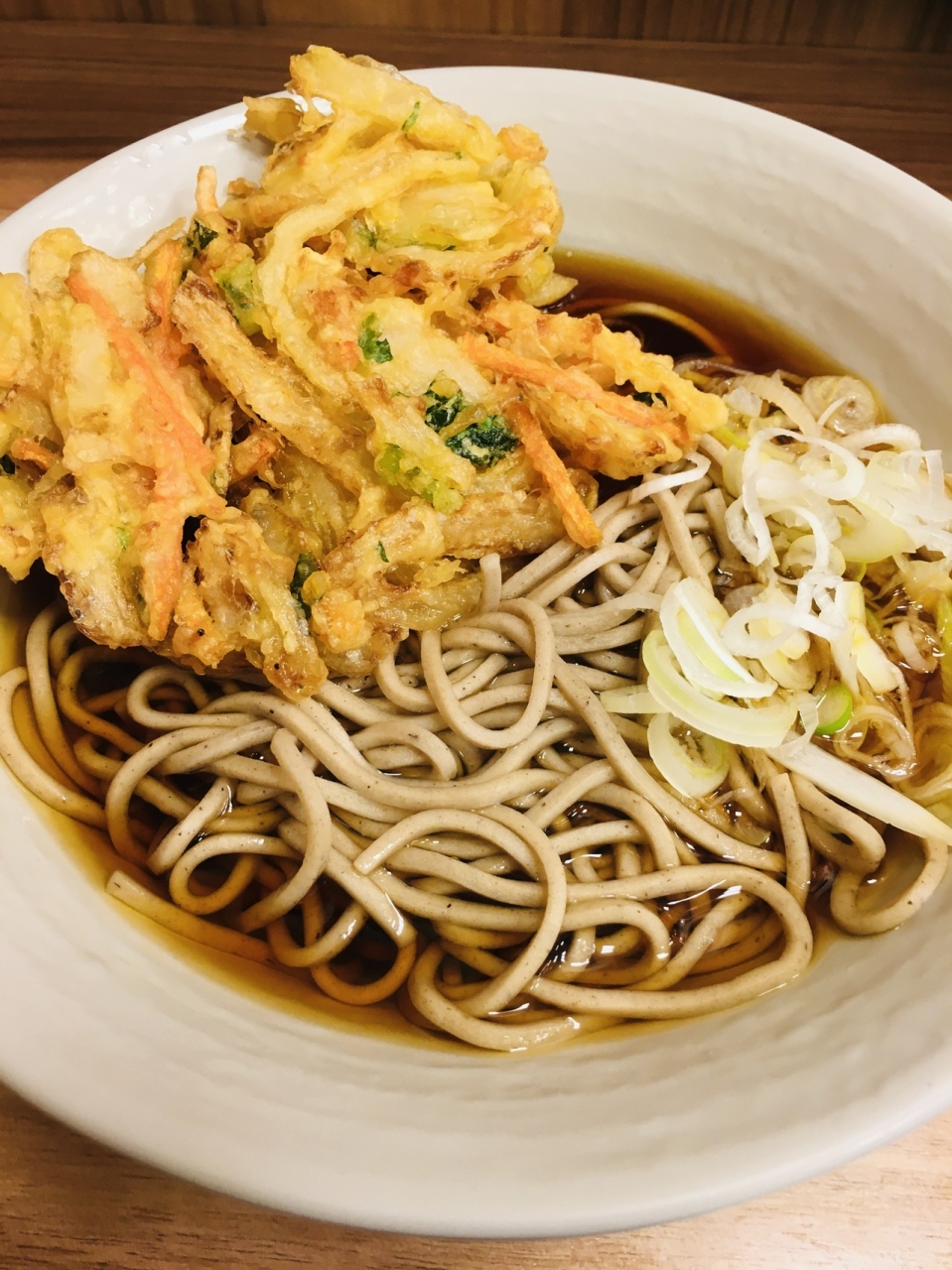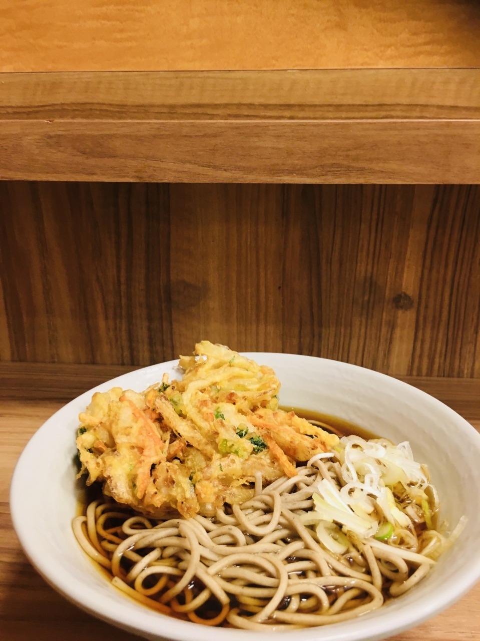 縦長の店内で自動食券機が一つあり、立ち食いカウンターと座席があるカウンターがあります。そばを啜った瞬間には汁はかなり濃いめと感じました。そばは少し硬いそばでかき揚げは汁に染み込んでも崩れなかったです。ネギが添えられていました。