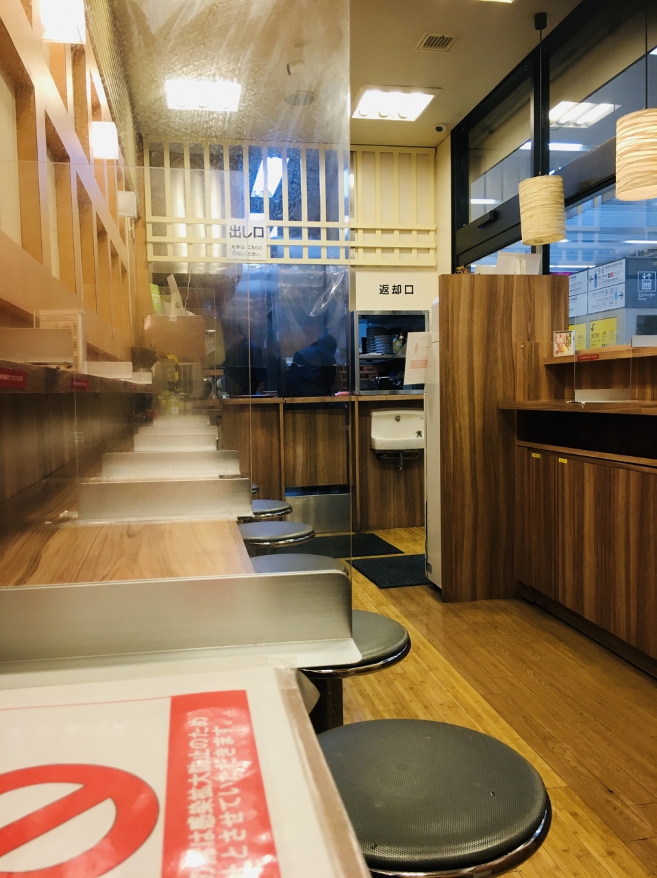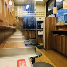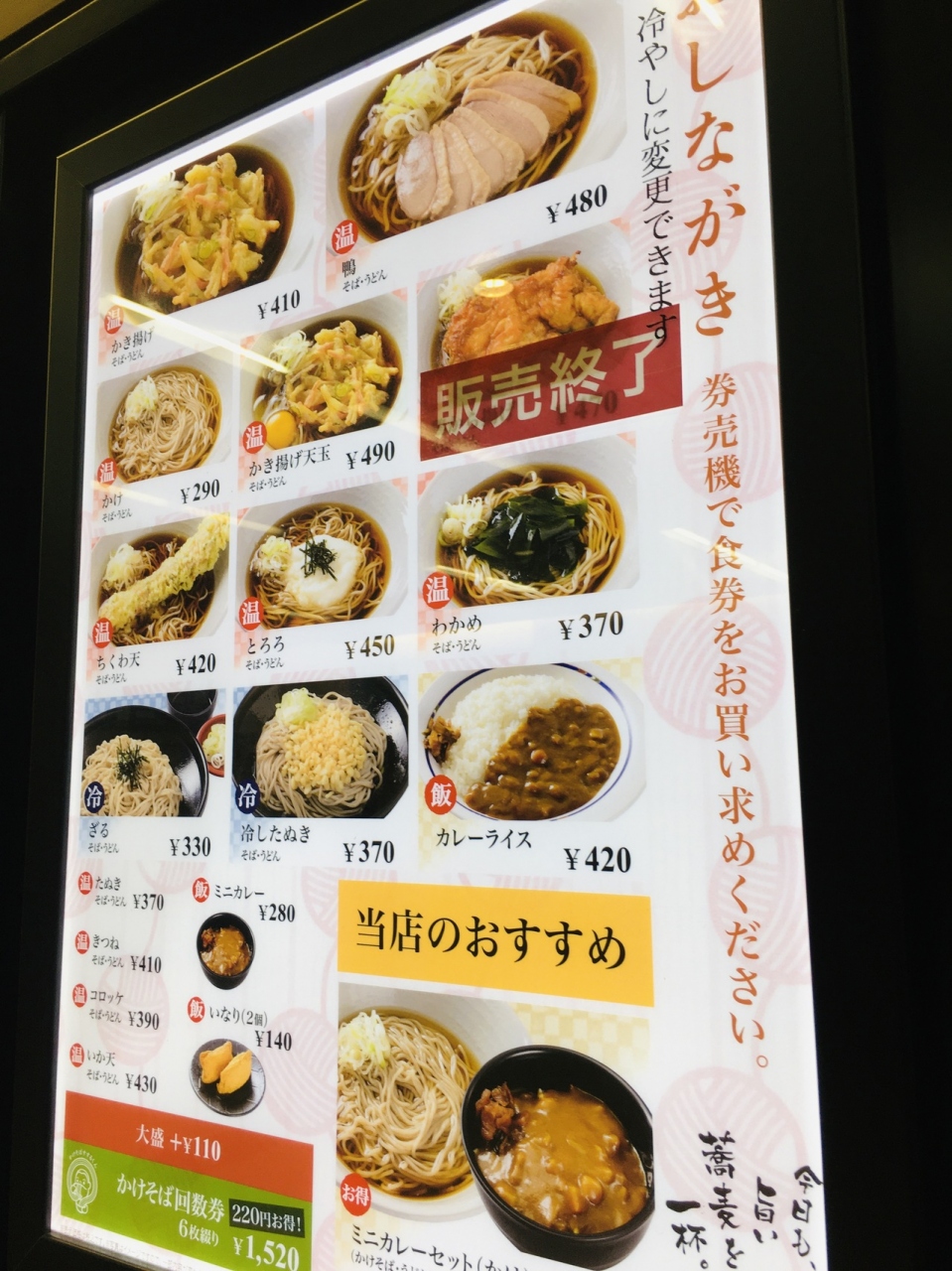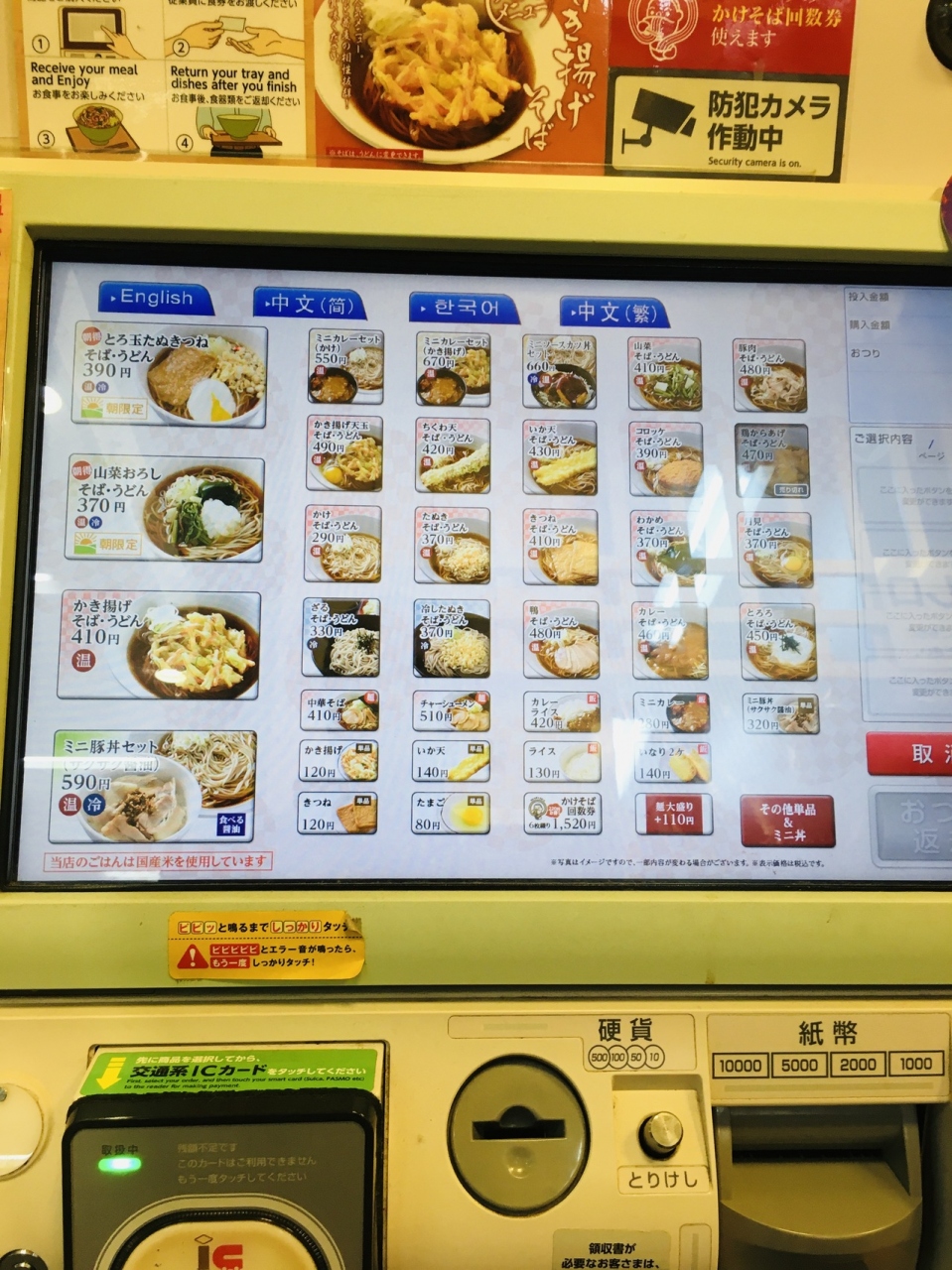 縦長の店内で自動食券機が一つあり、立ち食いカウンターと座席があるカウンターがあります。そばを啜った瞬間には汁はかなり濃いめと感じました。そばは少し硬いそばでかき揚げは汁に染み込んでも崩れなかったです。ネギが添えられていました。