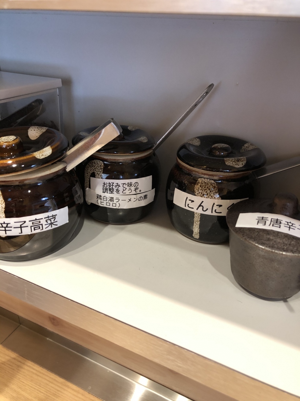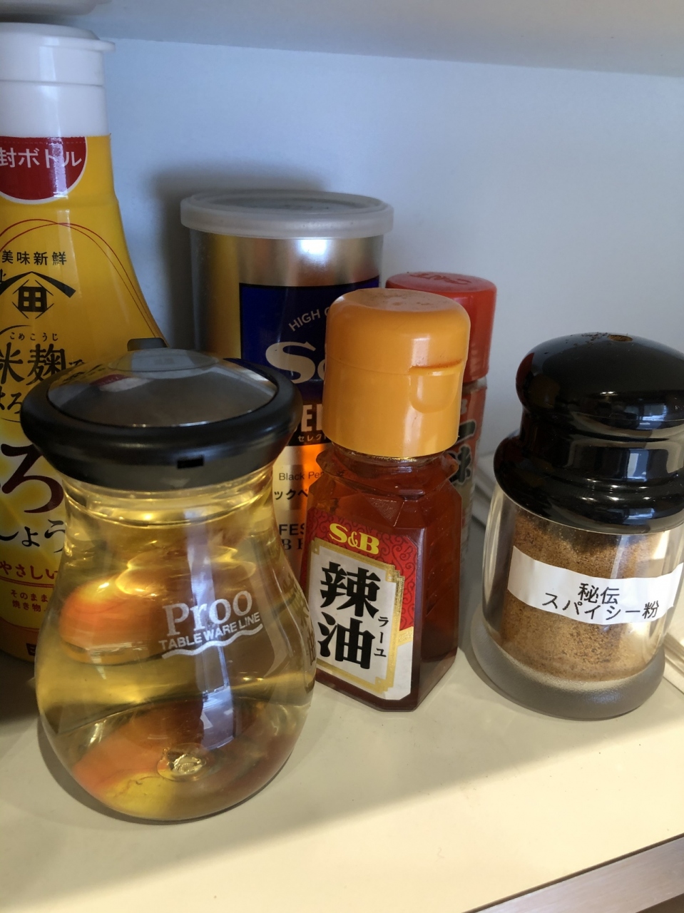 テーブルにはコショー、唐辛子、ラー油など調味料が並ぶ…そんな中で「秘伝スパイシー粉」が良かった