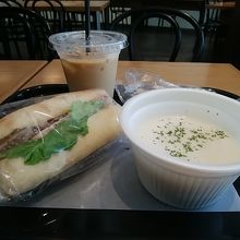 「鶏のココナッツサンド」462円(10%税込)と「本日のスープ(じゃがいもの冷製スープ)」605円(10%税込)と「アイスラテ」528円(10%税込)を…。
