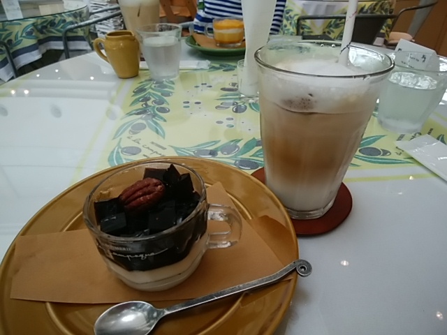 「アイスカフェラテ」660円(10%税込)と「コーヒーゼリー」495円(10%税込)を注文。コーヒーゼリーは、ふるふるなババロアの上に角切りコーヒーゼリー。美味しい。