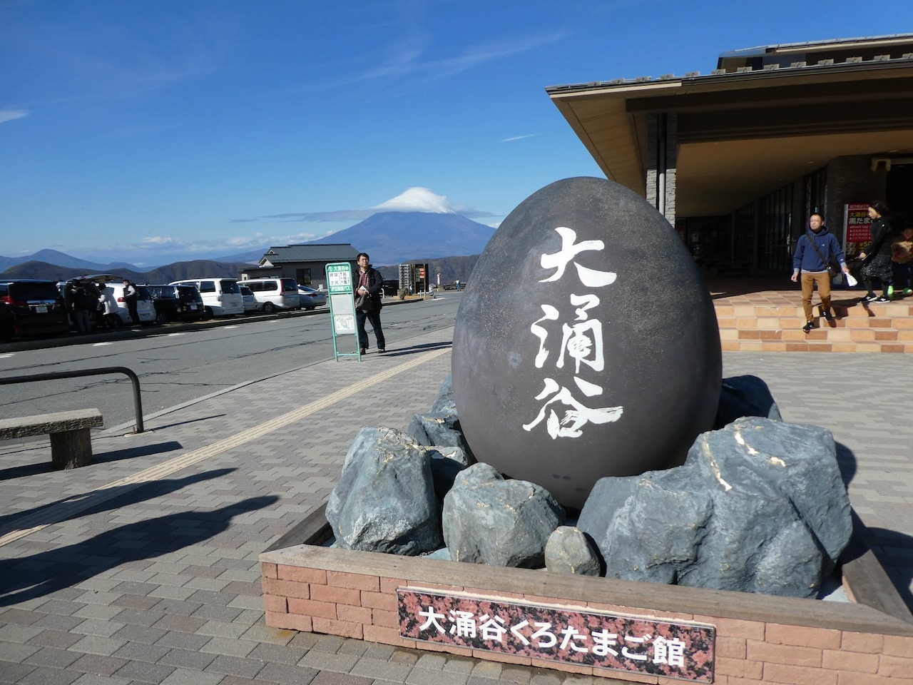 大涌谷に大きな建物は3つ。ロープウェイの駅から2分くらいゆるやかな坂道を下って登ったところ。建物自体も黒いのですぐわかります。