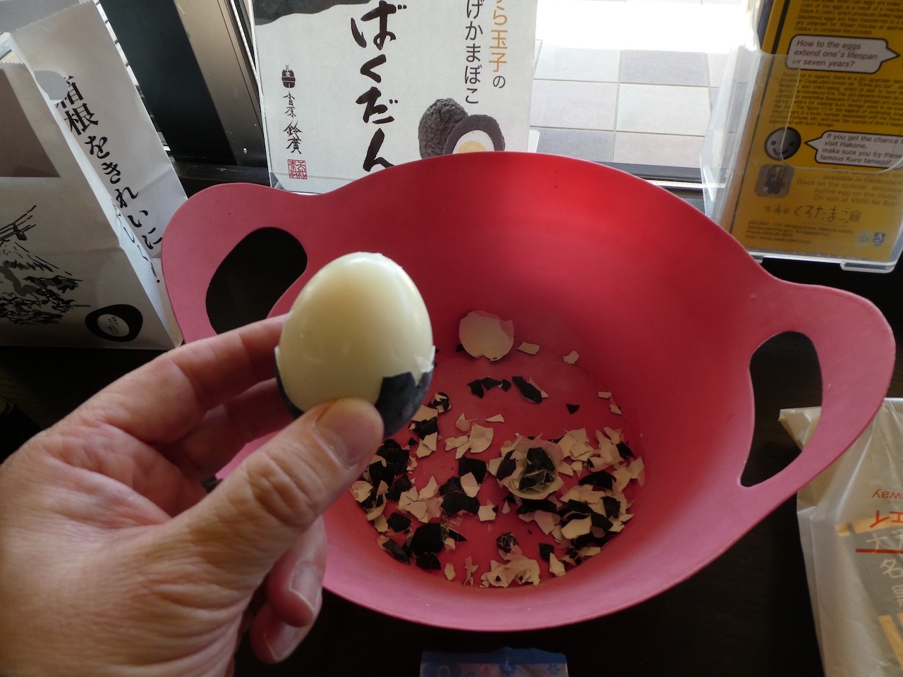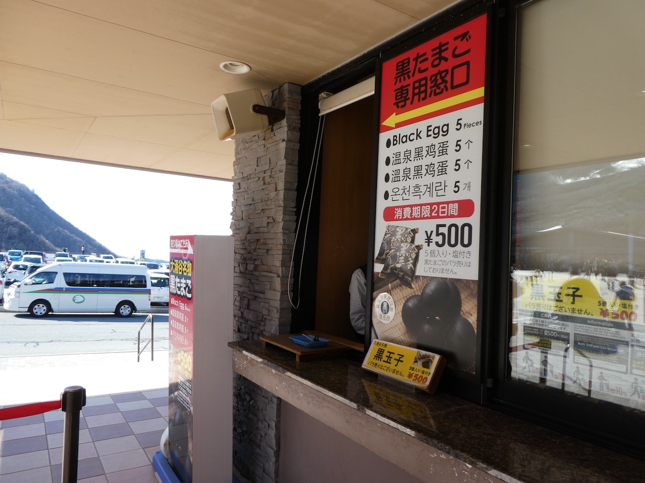 要は大きなお土産物屋さんなわけですが、なんといっても黒たまごの販売でしょう。外から直接購入できる窓口があって、5個入り500円。そんなに列はなく、待っていても3人くらいでした。