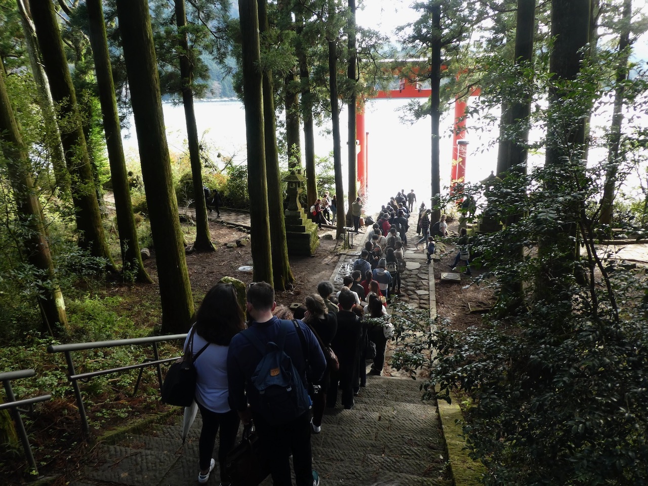 湖へ没してゆく参道。湖に浮かぶ鳥居。そしてそこには60人を超える大行列。遅々として進まず。