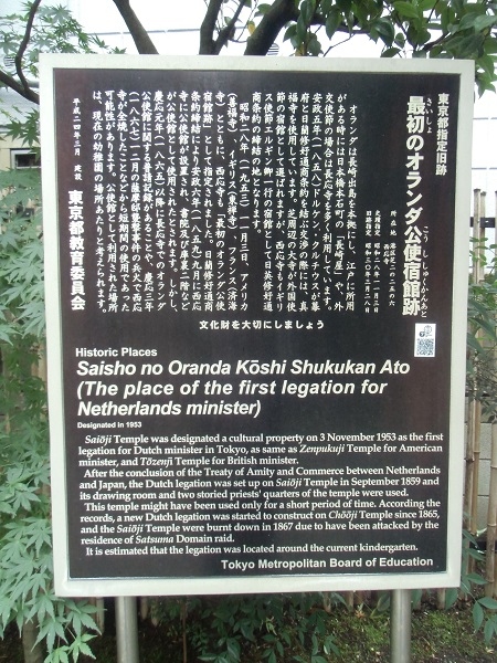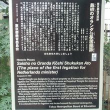 説明板によると、幕末や明治時代、芝周辺の大きなお寺は外国使節の宿館として使われたそうで、西応寺もその一つ。