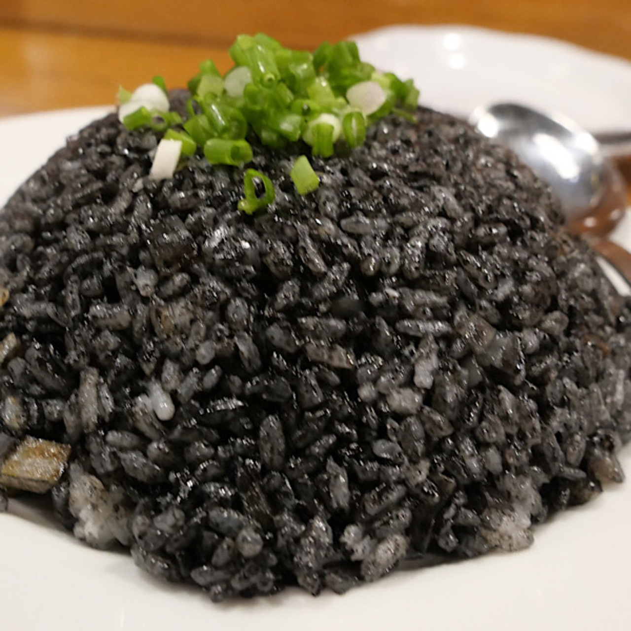 野菜チャンプルーとイカ墨チャーハン、それに泡盛を水割りで頂きました。こちらのイカスミ炒飯はマイルドながらコクと旨味が強く、お腹がいっぱいでも、もう一口、もう一口、と食べたくなる美味しさでした。