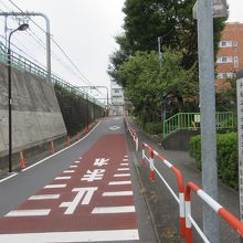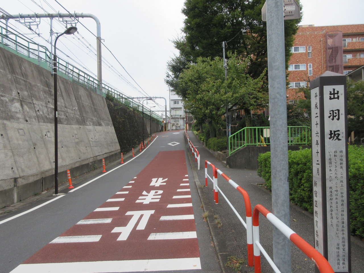 総武線線路と二葉乳児院の間にある、狭く120度に曲がった急な坂道です。明治維新後に、松江藩主松平出羽守家の屋敷が移転してきたことから名付けられたそうで、当時は庭園も存在していたようです。現在、坂沿いには小さな公園や花壇がありますが、特筆すべきものは見られませんでした。