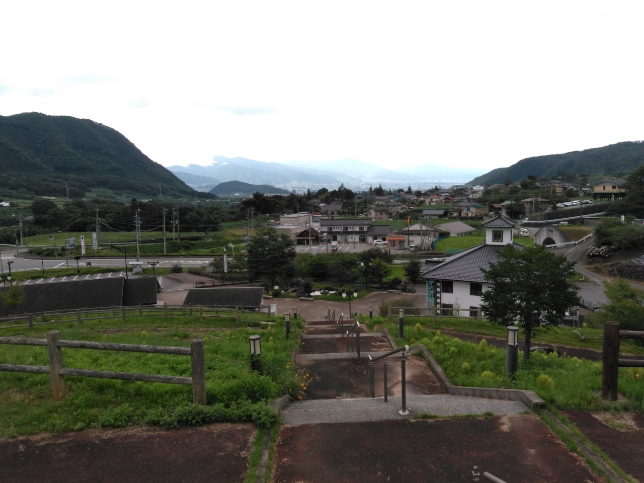 道の駅の建物はあまり大きくありませんが、周辺が「彩甲斐公園」になっていて、「富士見の丘」という名の展望台、「旧室伏学校」の「牧丘郷土文化館」などがあります。富士山も見えず、コロナ禍で、人がいませんでした。