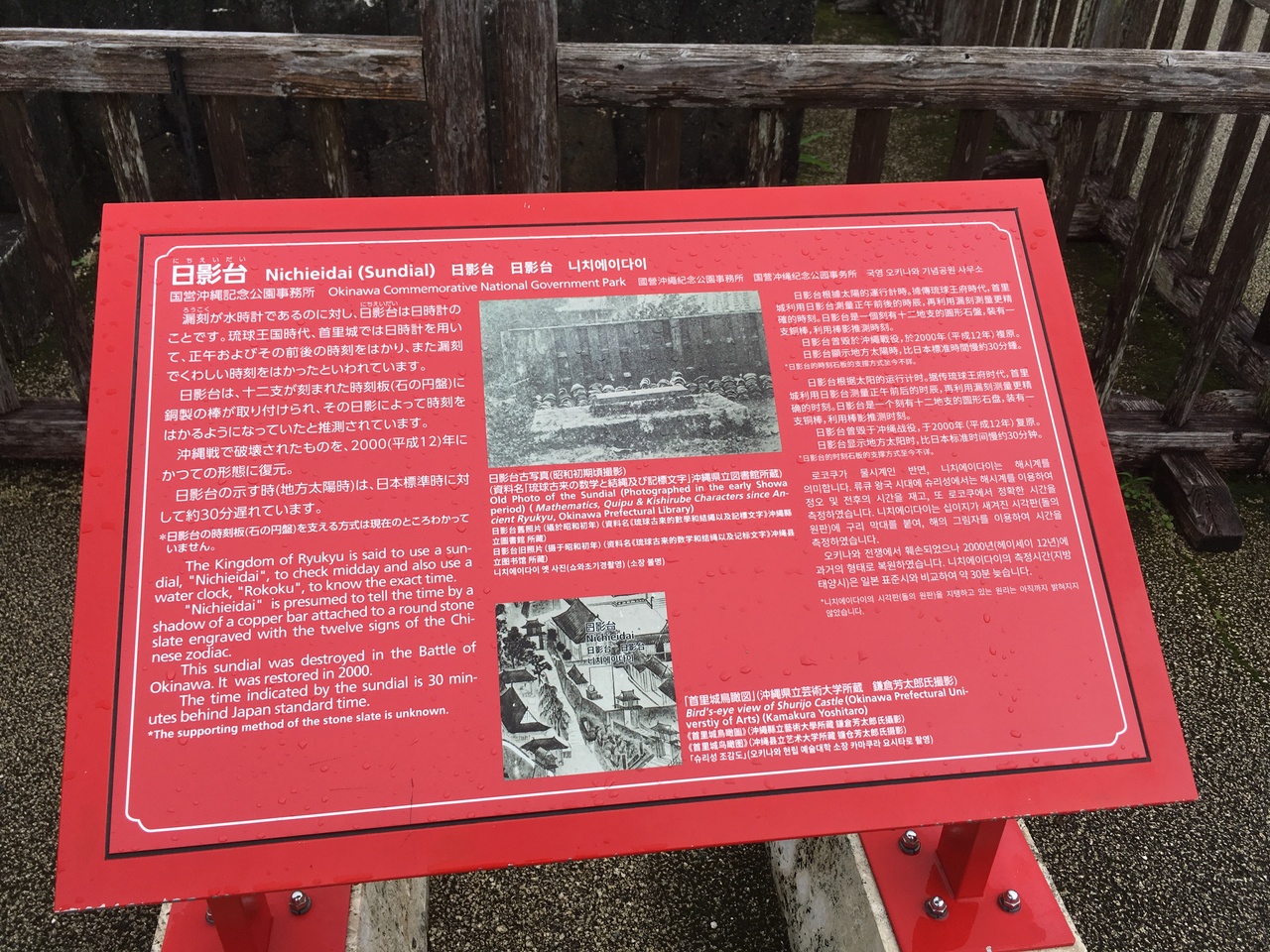 日影台は、首里城公園の漏刻門を潜ったところの広場にあります。これは、日時計です。琉球王国時代、水時計の補助的な道具としてして1739年に設置されたもので、1879年の廃藩置県まで使用されていた。尚、水時計は漏刻門にあったとのことです。興味がある方は、探してみては如何でしょうか。説明書きもありました。