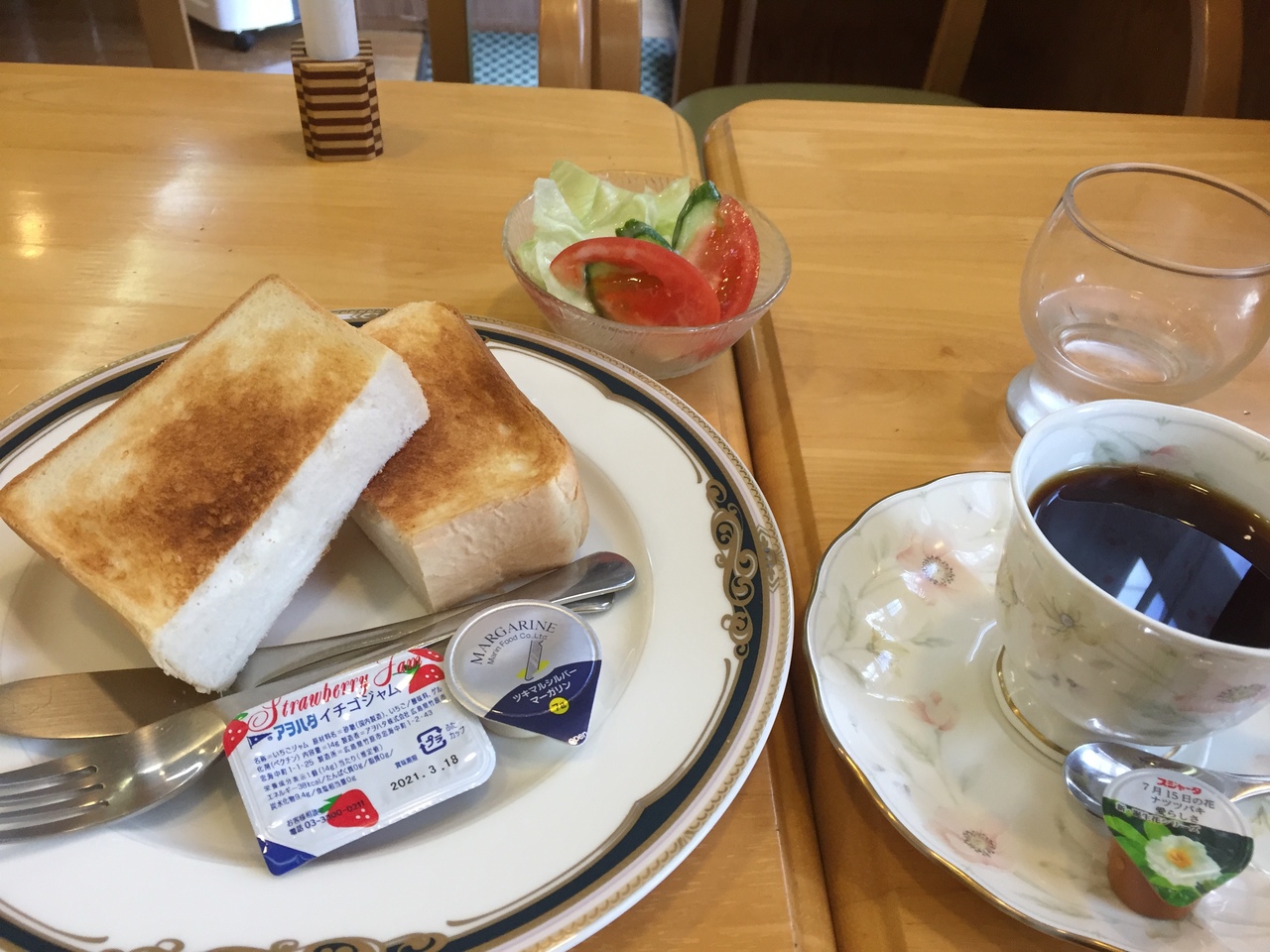 ご夫婦でやっている昔ながらの喫茶店。通りかかり、ここに入ろうと。開店には少し早かったけどどうぞ、ということでおじゃましました。トーストセットをオーダー。壁には絵画、芸能人のサイン、箱根登山鉄道の写真など見ながら待っているのは楽しい。豆を挽く音が聞こえてくる。渡邊ベーカリーのパンを使用したトーストはバリっと丁度良く焼けていて、このままで美味しい。コーヒーはブレンド加減がまろやかで好みの味です。実はHホテルで朝食を食べたかったけれど、5分程過ぎてだめでした。でも、結果ラッキー。また今度チャレンジとしましょう。