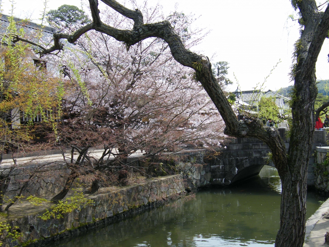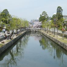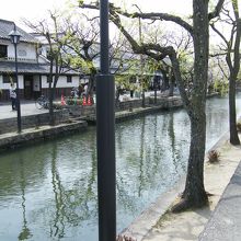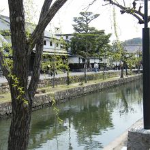 倉敷川沿いに白壁と柳の町並、水面に映る景色。