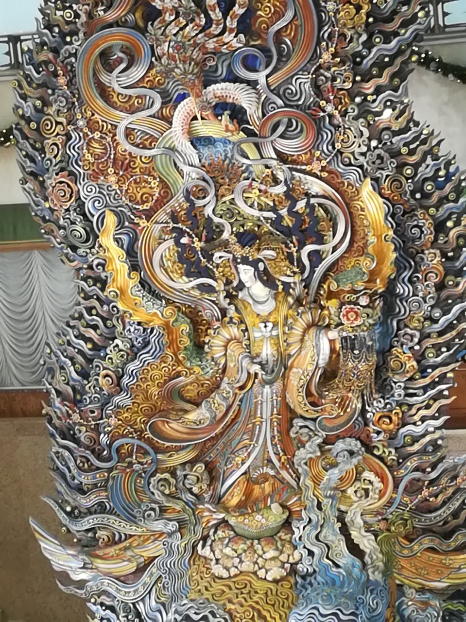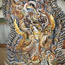5階まで吹き抜けの中央ホールにそびえたつ天女像です。三越の基本理念、まごころの精神を象徴する像ですが、高さ約11メートルの木彫刻作品だそうです。名匠、佐藤玄々氏によって、約10年の歳月をかけ1960年に建立されたそうですが、大変素晴らしく、ずっと見ていられます。