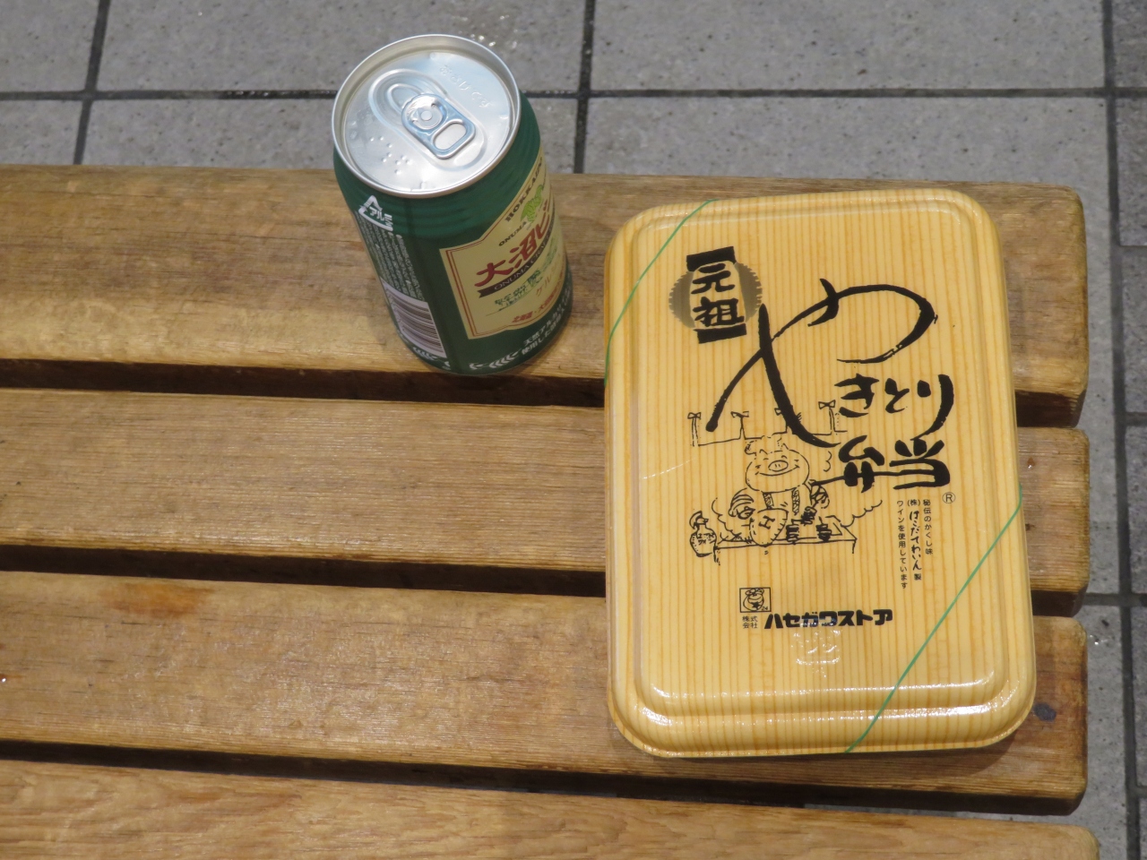 やき弁を駅までもっていって、駅のベンチで大沼地ビールと一緒に食べました。