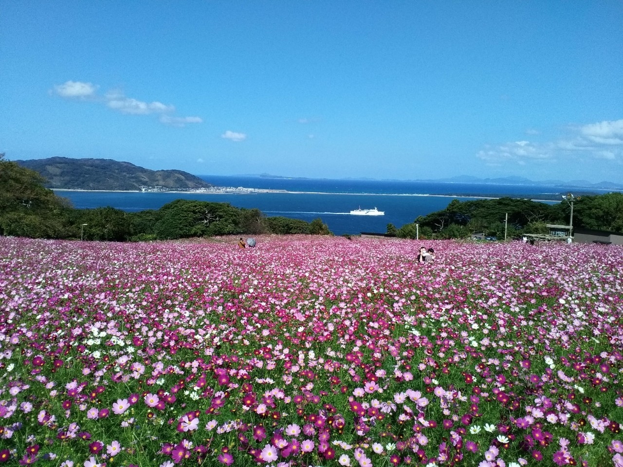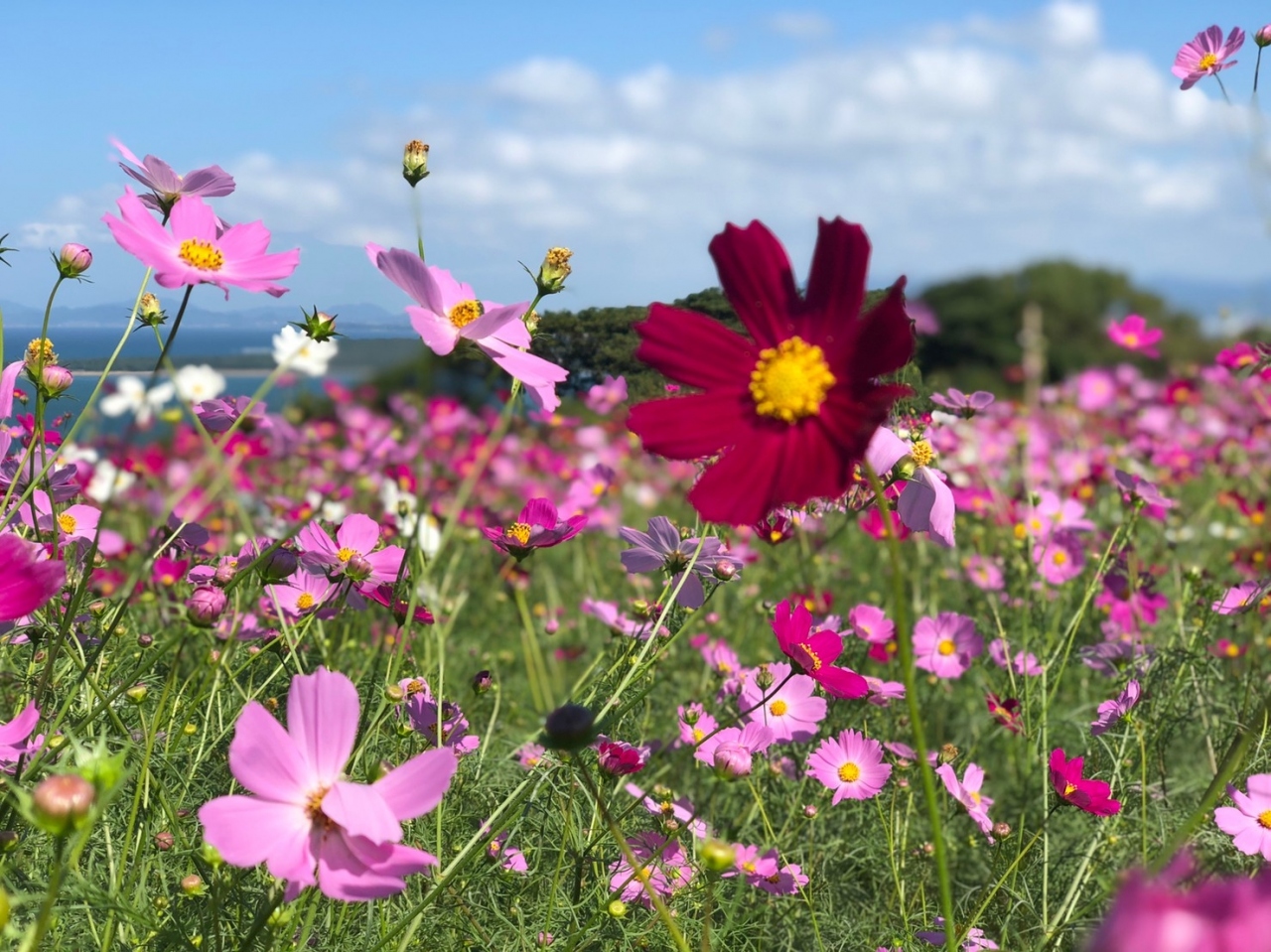 10月ののこのしまアイランドパークは花畑の秋桜が満開の時期を迎えとても多くの見物客が訪れています。パーク内には色んな施設が揃っていて家族連れで訪れても1日過ごせる福岡市の憩いの場所となっています。