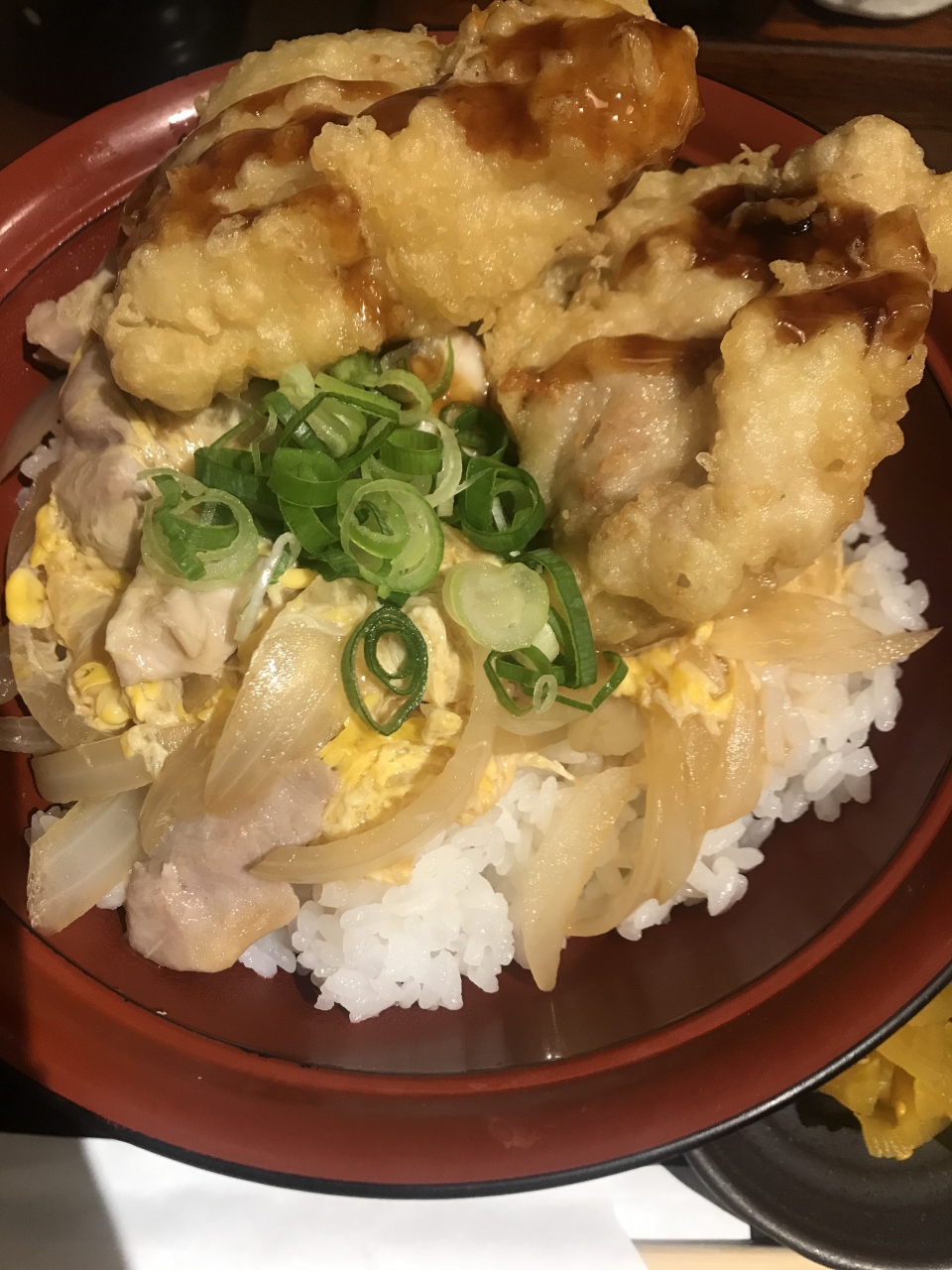 普通の親子丼に、とり天が2枚のっている、初めてのスタイルでした。