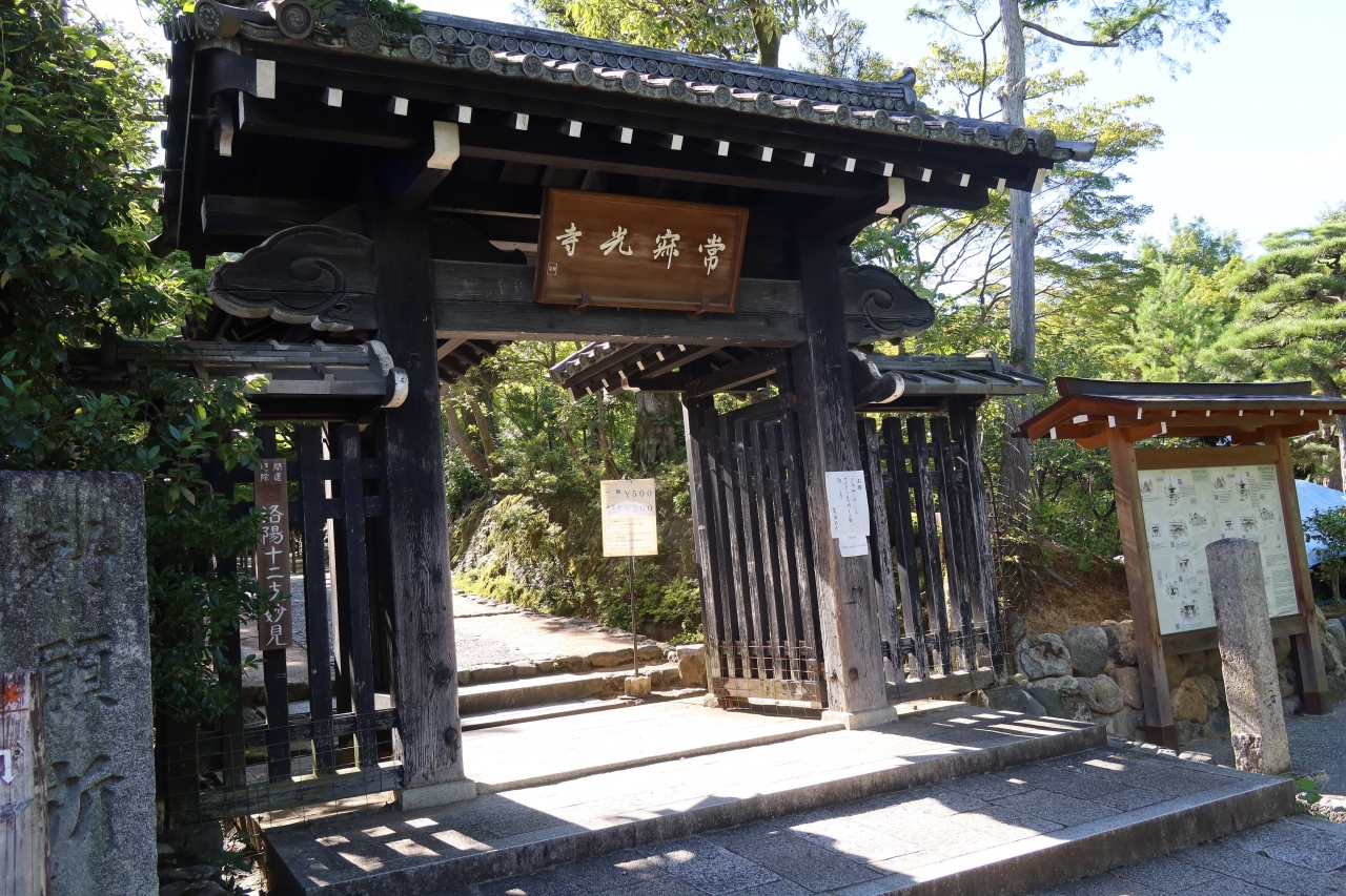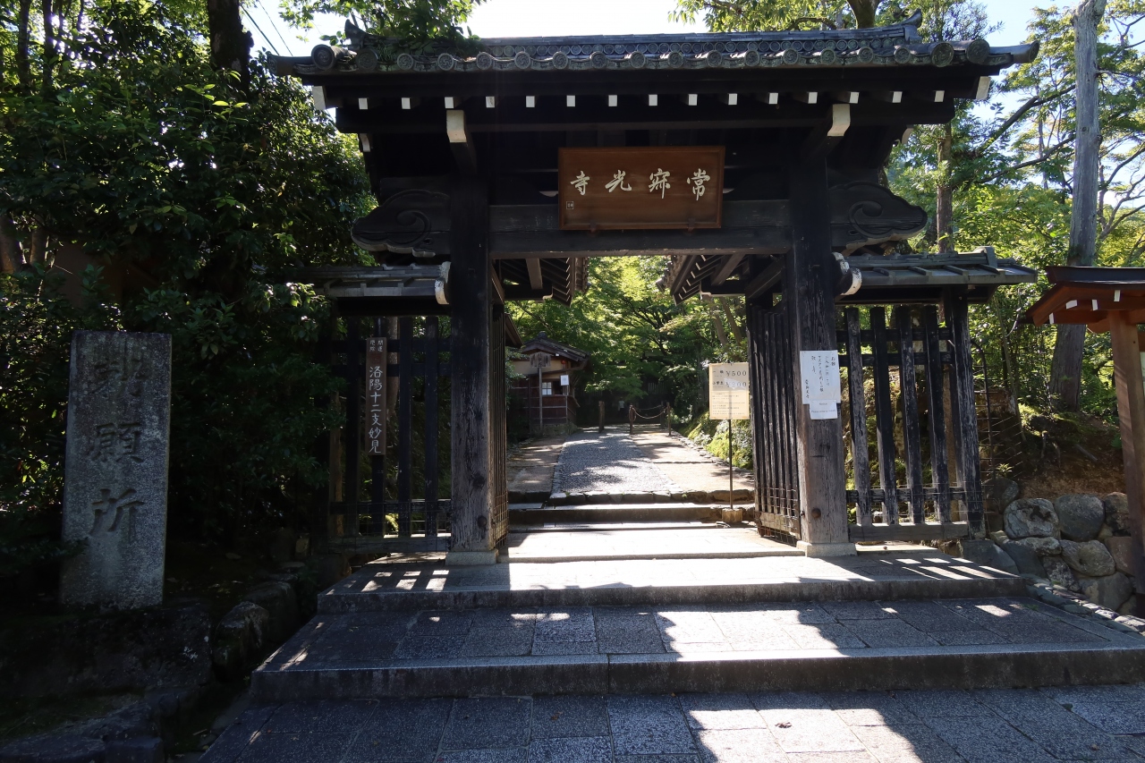 嵯峨野の小倉山の麓にある常寂光寺の入口にあたる門が山門です。江戸時代の後期に建てられた薬医門で、この先に拝観受付があります。黒色に塗られた山門は周りの雰囲気に溶け込んでいますが、この奥に仁王門が見えるので、そちらにどうしても眼が行ってしまいます。
