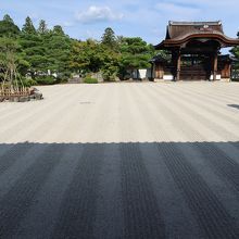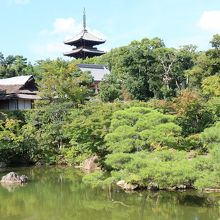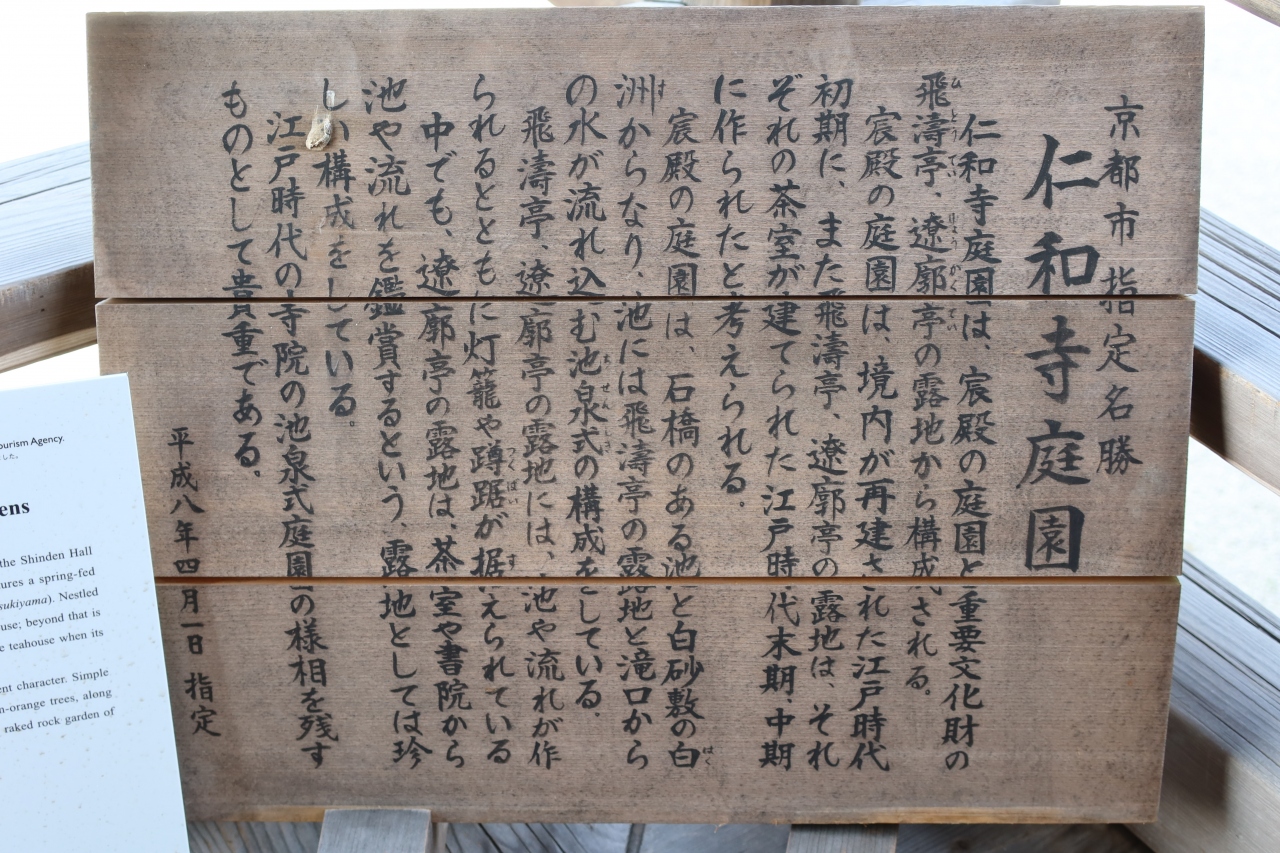 世界遺産に指定される仁和寺の二王門を潜り左手に行った所に御殿(旧御室御所)があります。この御所には宸殿を挟んで南側に勅使門の前に広がる白砂が美しい南庭、北側に五重塔をバックにした池泉式庭園の二つがあります。同じ場所で全く趣きが異なる庭園が見られる所が面白く見応えがあります。