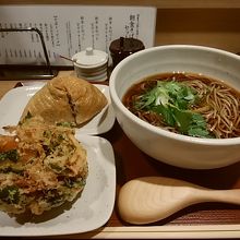 温かいおそばを注文。ねぎ、三つ葉、柚子が散らされています。かき揚げには海老も入り、お野菜もたっぷり。