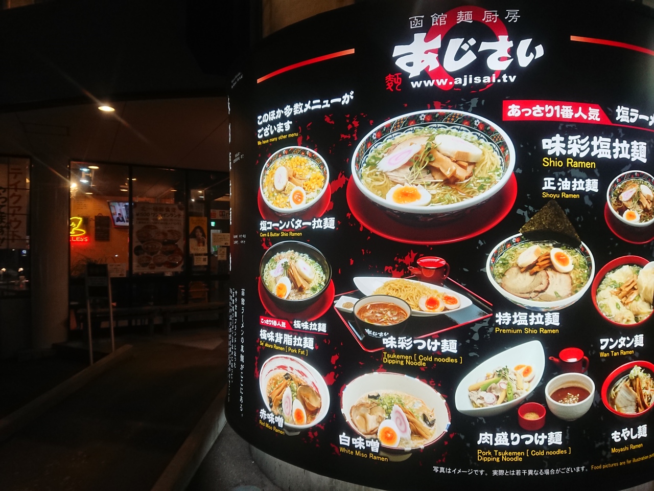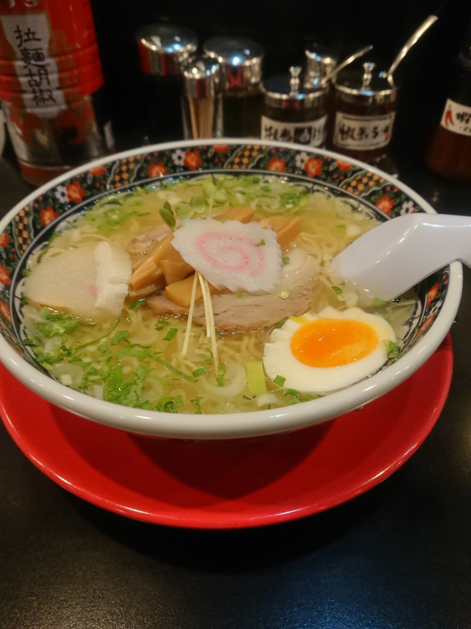 五稜郭タワーの向かいにある有名なラーメン屋さん。行列ができる店と聞いてましたが、平日の夜はガラガラでゆっくり食事を堪能できました。入口の券売機で名を馳せた塩ラーメン800円をオーダー。この日はかなり空腹だったので、炒飯ハーフサイズもつけました。テーブルにはお店のオリジナルと思われる調味料がいろいろあります。