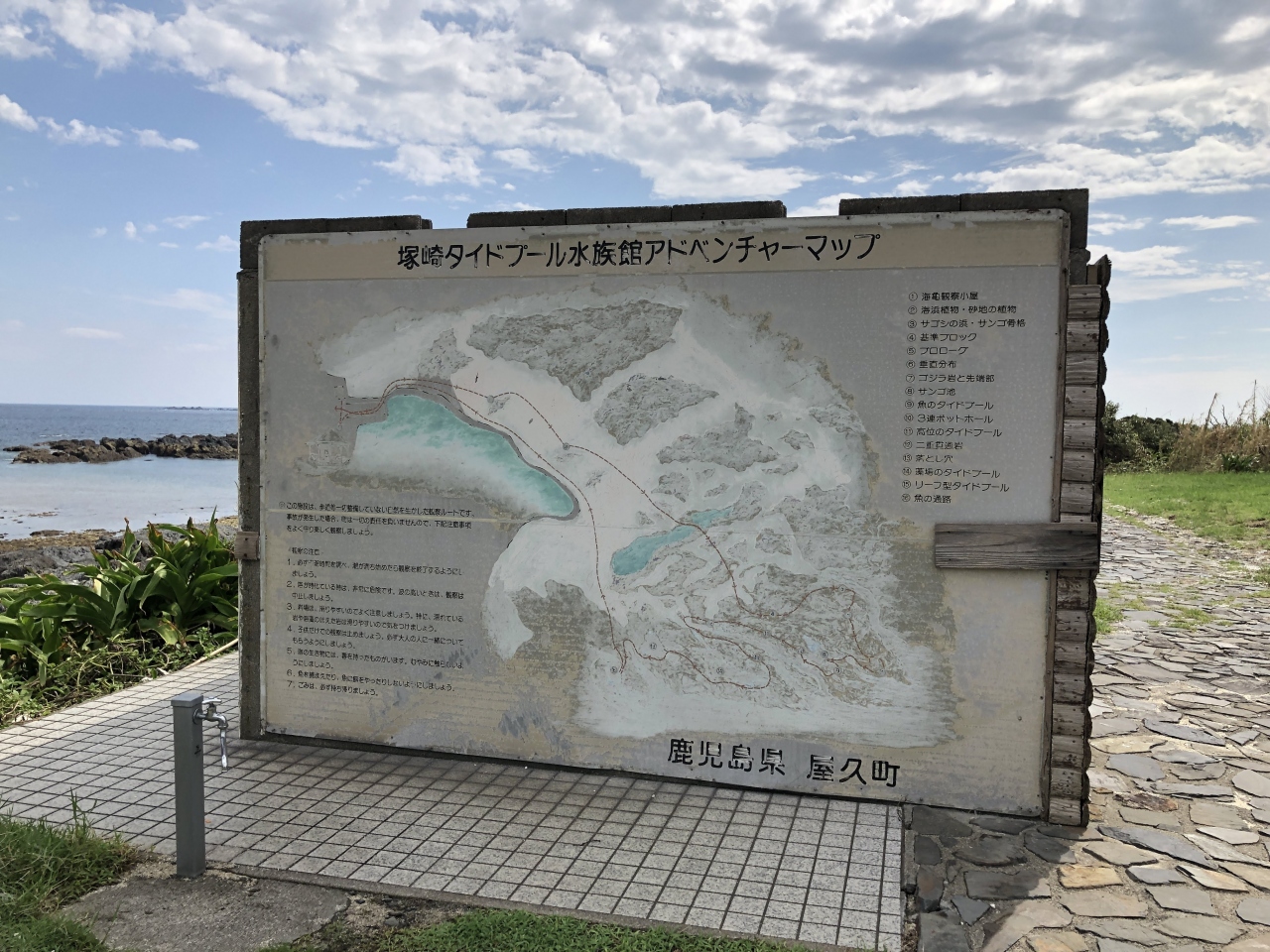 屋久島にある、潮溜まりが見られるスポットです。すぐ近くまで車で行くことができ、キャンピングカーのような大きめの車も止められていました。干潮時の周遊ルートの看板が出ていて、山だけではなく海を楽しめるのも屋久島の魅力だと思いました。