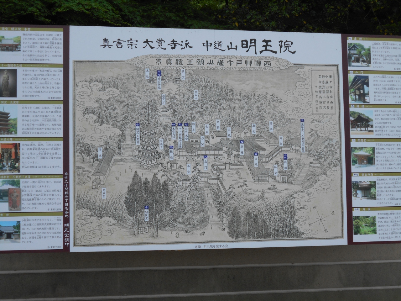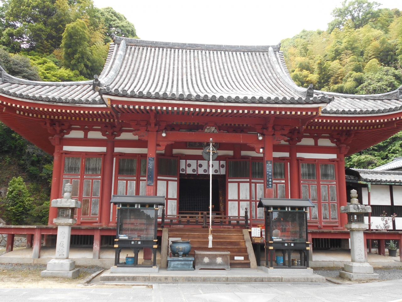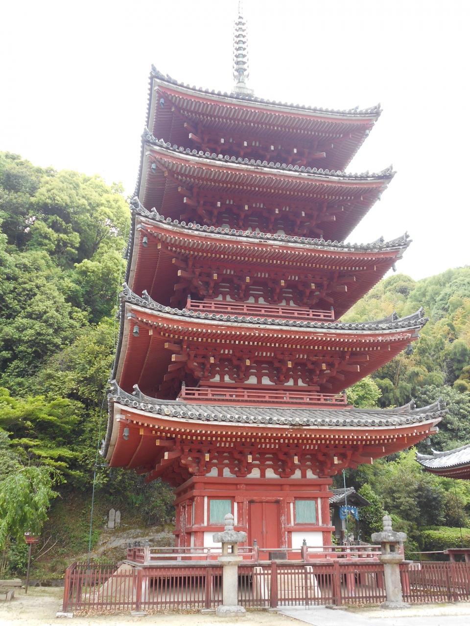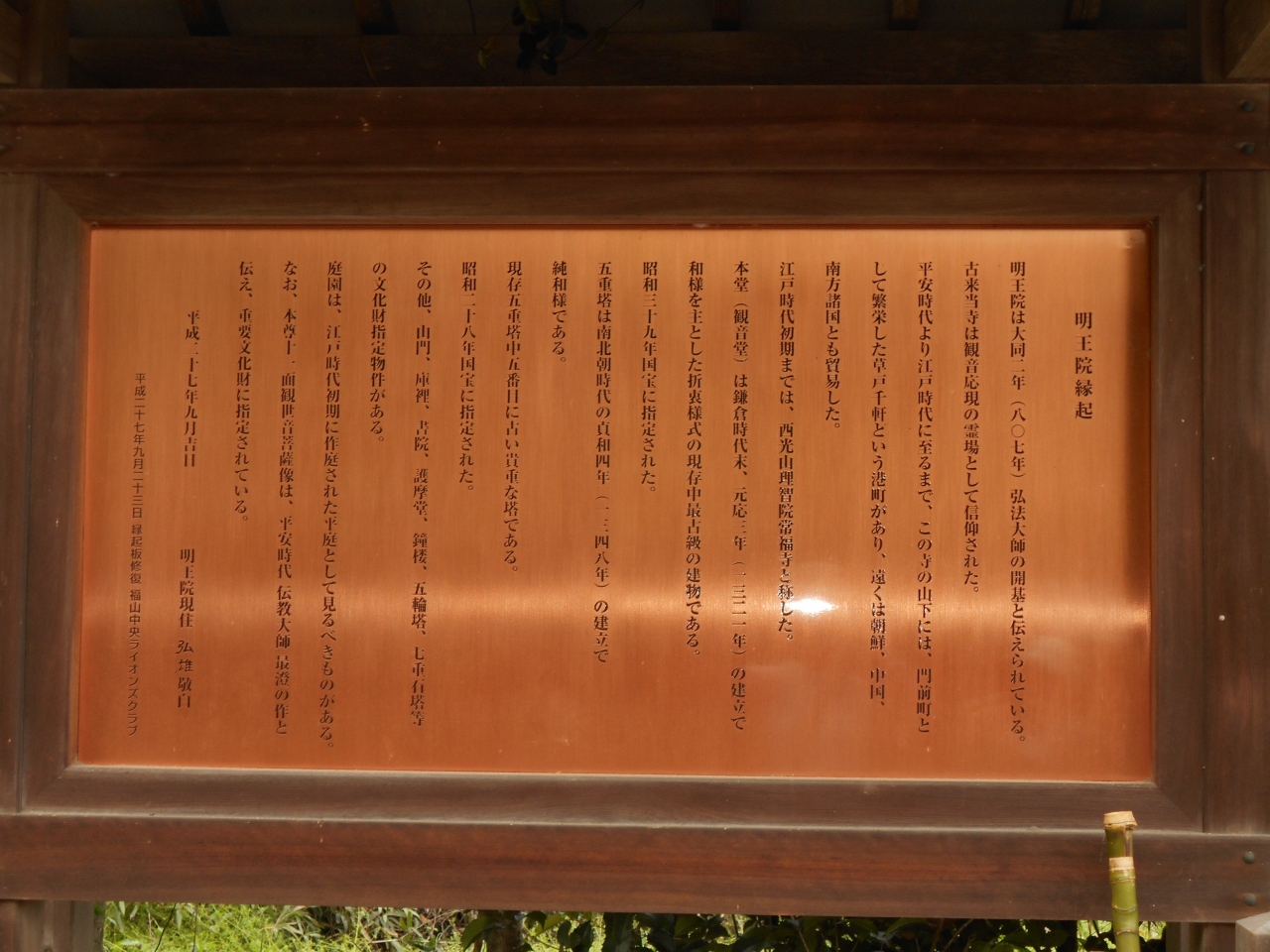 807年、空海開基と伝わる真言宗の寺院です。芦田川に面した愛宕山の麓にあります。芦田川沿いの駐車場(無料)から、石段を登って山門に向かいます。山門をくぐると視界が開け、広い境内になっています。本堂は、和様を基調とし、唐様も採用している折衷様式で国宝に指定されています。また、高さ約29メートルの国宝の五重塔は朱が鮮やかで凛とそびえています。