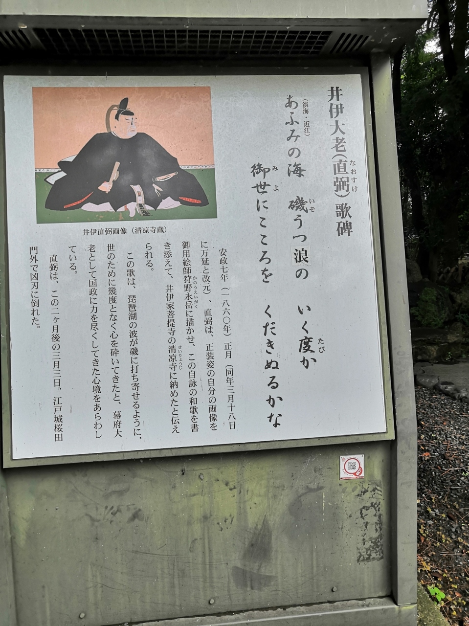 こちらの地図だと彦根城の中のような感じですが、実際にはお濠の外のいろは松近くにあります。困難が何度押し寄せても、国の平和と安心を願って、全身全霊を尽くして心を砕いてきたので悔いは残らないという意味らしく、仕事に打ち込む決意が伺えました。