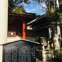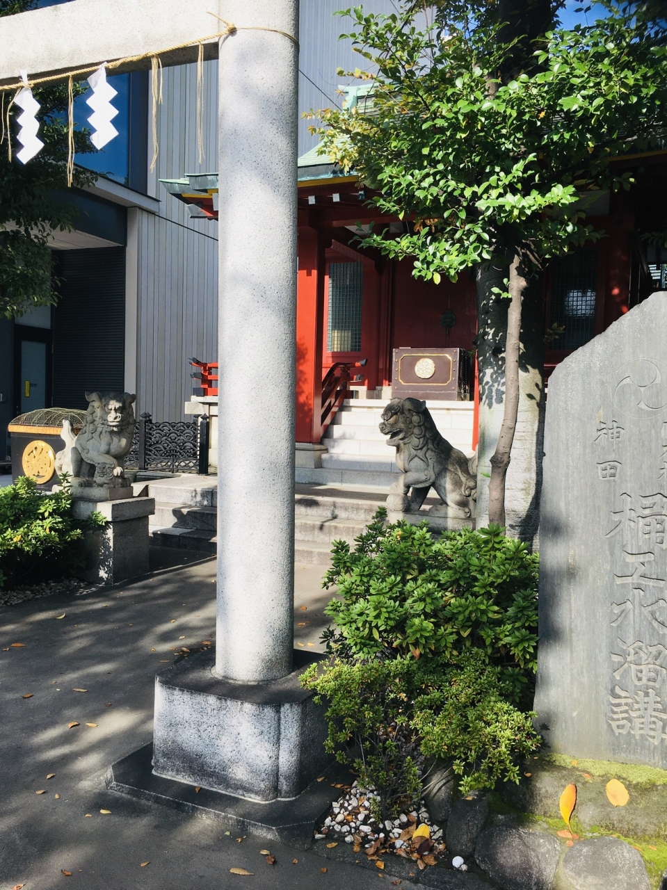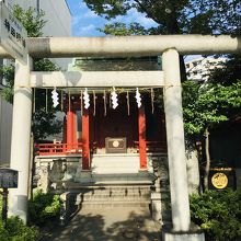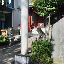 小さな神社が並んだ一番左側にありました。鳥居から社殿までが短く、その間に獅子の像、草木があり、社殿後方の右後ろには大きな木が立っていました。鳥居の上部にあるしめ縄が細く鋏で切れそうでした。賽銭箱に少し金色の部分がありました。