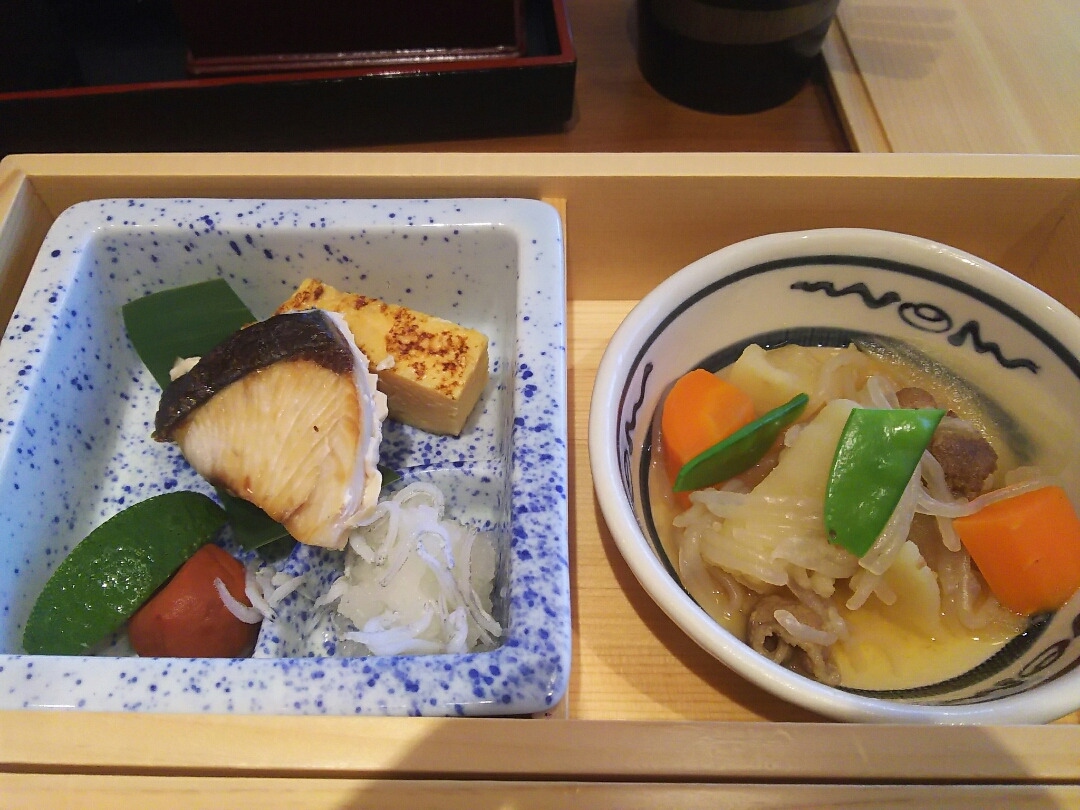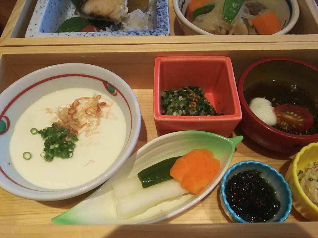 テーブルには、和御膳が運ばれてきて、肉じゃがやお豆腐、焼き魚がセットされています。ご飯や味噌汁、サラダ、ドリンクはバイキングになっています。