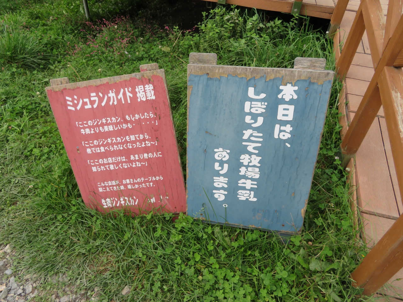 富良野から旭川空港へ行くのにナビを使ってのんびり一般道を走り、吹上温泉で時間を潰すつもりだった。道端のススキが気になり、車を停めて道草を食っていたら、遠くに何ともいかした牛舎が見えると思ったらレストランだった。ロケーションが素敵だと思って行ってみたらジンギスカンが食べられるレストランとあって即入った。帰る間際に大好きなジンギスカンが食べられて、この上ない幸せだった。サフォークラムで癖がなく、柔らかくて美味しかった。搾りたて牛乳もいただきました。飛行機の出発ぎりぎり迄有効に時間を遣う事が出来ました。