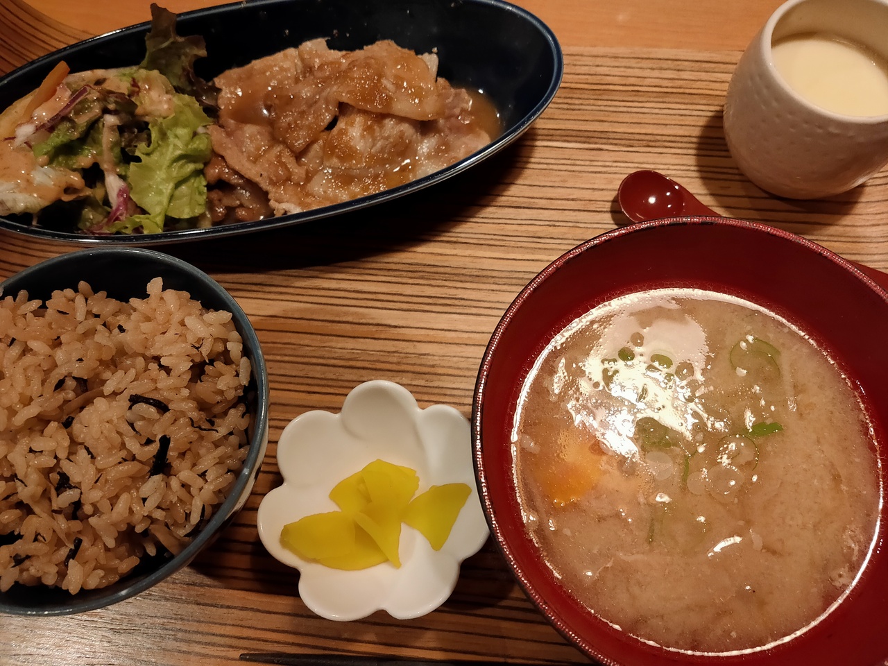 私は豚の生姜焼き定食を注文。ご飯・生姜焼き・サラダ・茶碗蒸し・豚汁・漬物ですが、ご飯は白米か炊き込みご飯を選べて、なおかつおかわり無料でした。お得です。