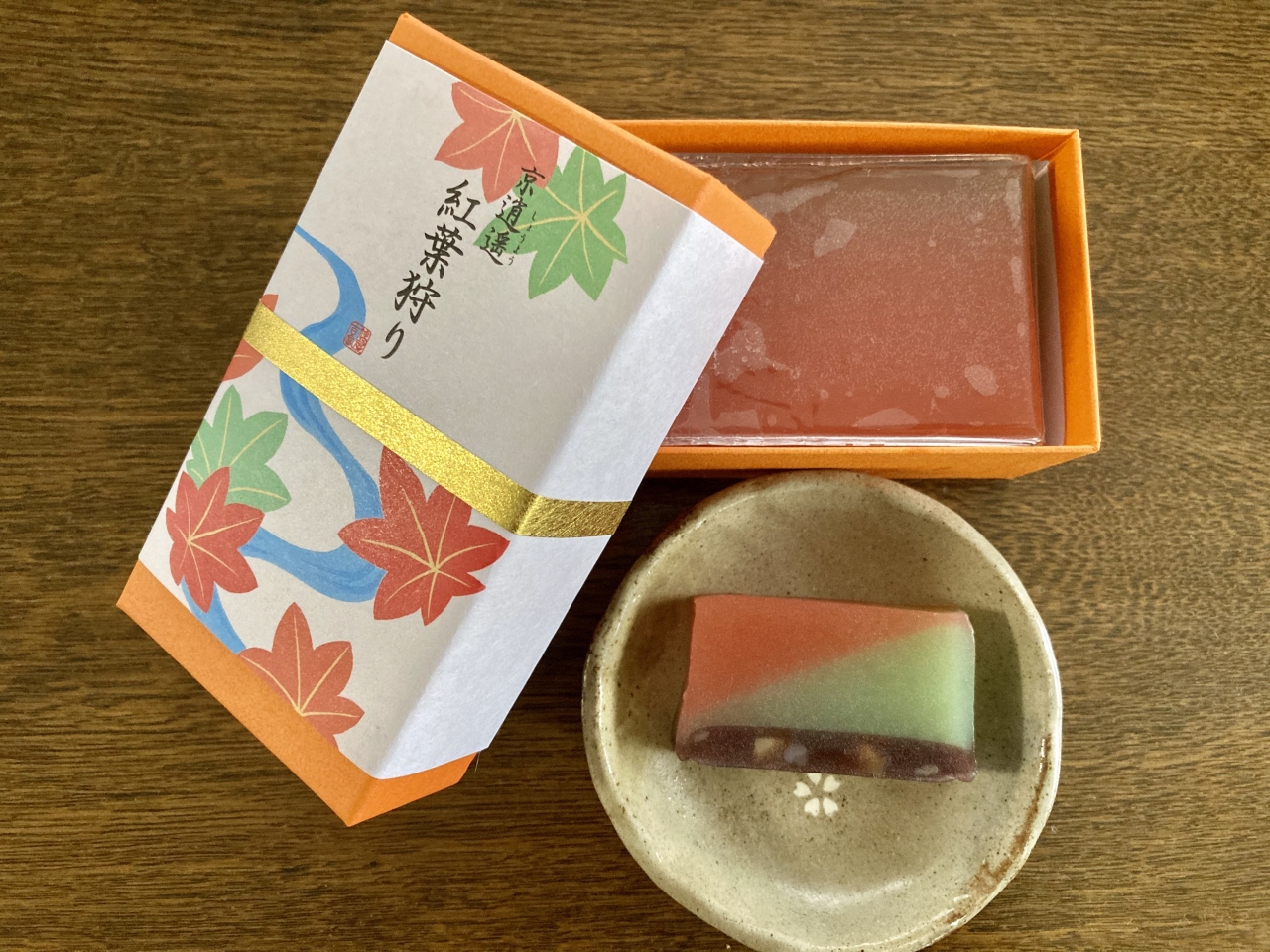 JR京都伊勢丹B1Fにある和菓子屋さん。通りすがりに『紅葉狩り』という羊羹の美しさに魅かれ購入しました。ハーフサイズで千円余り。超有名なお店の羊羹と比較すればリーズナブルだと思いました。ほんのりとした甘さで、見た目にも美しく、癒されました。